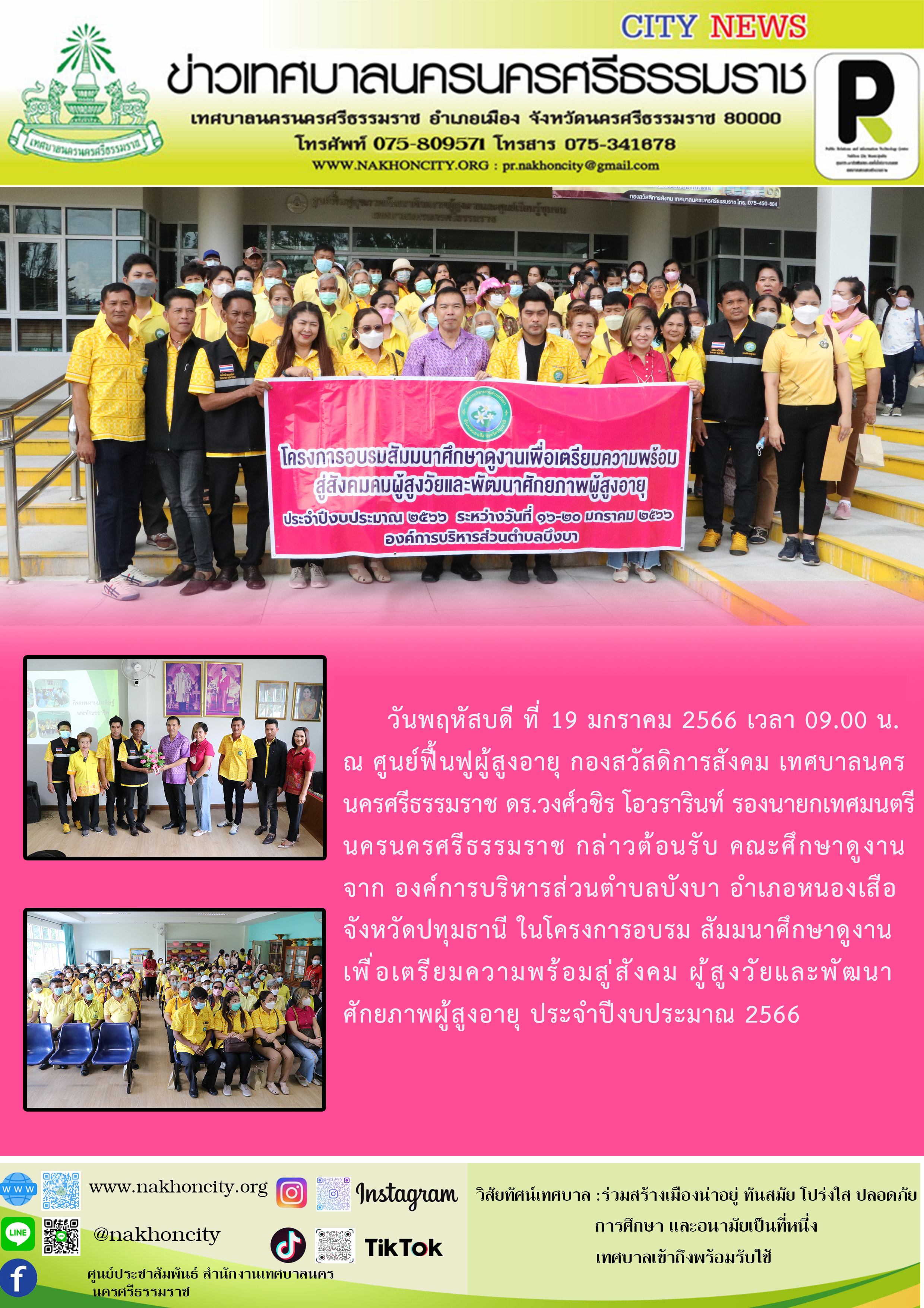วันพฤหัสบดี ที่ 19 มกราคม 2565 เวลา 09.00 น. ณ ศูนย์ฟื้นฟูผู้สูงอายุ กองสวัสดิการสังคม เทศบาลนครนครศรีธรรมราช ดร.วงศ์วชิร โอวรารินท์ รองนายกเทศมนตรีนครนครศรีธรรมราช กล่าวต้อนรับ คณะศึกษาดูงาน จาก องค์การบริหารส่วนตำบลบังบา อำเภอหนองเสือ จังหวัดปทุมธานี ในโครงการอบรมสัมมนาศึกษาดูงาน เพื่อเตรียมความพร้อมสู่สังคมผู้สูงวัยและพัฒนาศักยภาพผู้สูงอายุ ประจำปีงบประมาณ 2566