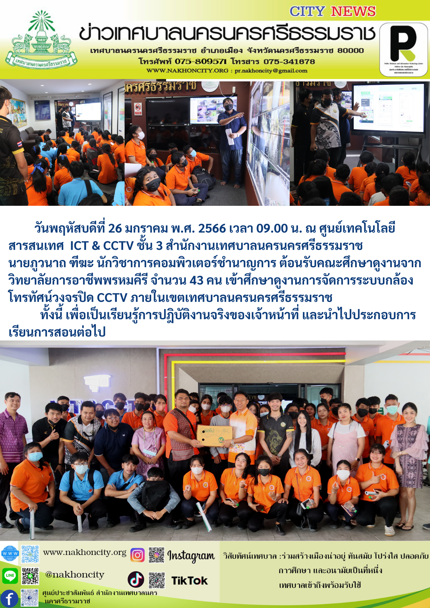 วันพฤหัสบดีที่ 26 มกราคม พ.ศ. 2566 เวลา 09.00 น. ณ ศูนย์เทคโนโลยีสารสนเทศ ICT & CCTV ชั้น 3 สำนักงานเทศบาลนครนครศรีธรรมราช นายภูวนาถ ฑีฆะ นักวิชาการคอมพิวเตอร์ชำนาญการ ต้อนรับคณะศึกษาดูงานจากวิทยาลัยการอาชีพพรหมคีรี จำนวน 43 คน เข้าศึกษาดูงานการจัดการระบบกล้องโทรทัศน์วงจรปิด CCTV ภายในเขตเทศบาลนครนครศรีธรรมราช ทั้งนี้ เพื่อเป็นเรียนรู้การปฎิบัติงานจริงของเจ้าหน้าที่ และนำไปประกอบการเรียนการสอนต่อไป