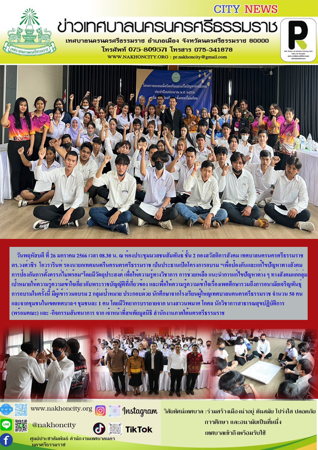 วัน พฤหัสบดี ที่ 26 มกราคม 2566 เวลา 08.30 น. ณ ห้องประชุมมวลชนสัมพันธ์ ชั้น 2 กองสวัสดิการสังคม เทศบาลนครนครศรีธรรมราช ดร.วงศ์วชิร โอวรารินท์ รองนายกเทศมนตรีนครนครศรีธรรมราช เป็นประธานเปิดโครงการอบรม “เพื่อป้องกันและแก้ไขปัญหาทางสังคมการป้องกันการตั้งครรภ์ไม่พร้อม”โดยมีวัตถุประสงค์ เพื่อให้ความรู้ทางวิชาการ การช่วยเหลือ แนะนำการแก้ไขปัญหาต่าง ๆ ทางสังคมแก่กลุ่มเป้าหมายให้ความรู้ความเข้าใจเกี่ยวกับพระราชบัญญัติที่เกี่ยวข้อง และเพื่อให้ความรู้ความเข้าใจเรื่องเพศศึกษารวมถึงการอนามัยเจริญพันธุ์ การอบรมในครั้งนี้ มีผู้เข้าร่วมอบรม 2 กลุ่มเป้าหมาย ประกอบด้วย นักศึกษาจากโรงเรียนผู้ใหญ่เทศบาลนครนครศรีธรรมราช จำนวน 50 คน และจากชุมชนในเขตเทศบาลฯ ชุมชนละ 1 คน โดยมีวิทยากรบรรยายจาก นางสาวนพมาศ โกศล นักวิชาการสาธารณสุขปฏิบัติการ (พร้อมคณะ) และ -กิจกรรมสันทนาการ จาก เจ้าหน้าที่สหทัยมูลนิธิ สำนักงานภาคใต้นครศรีธรรมราช
