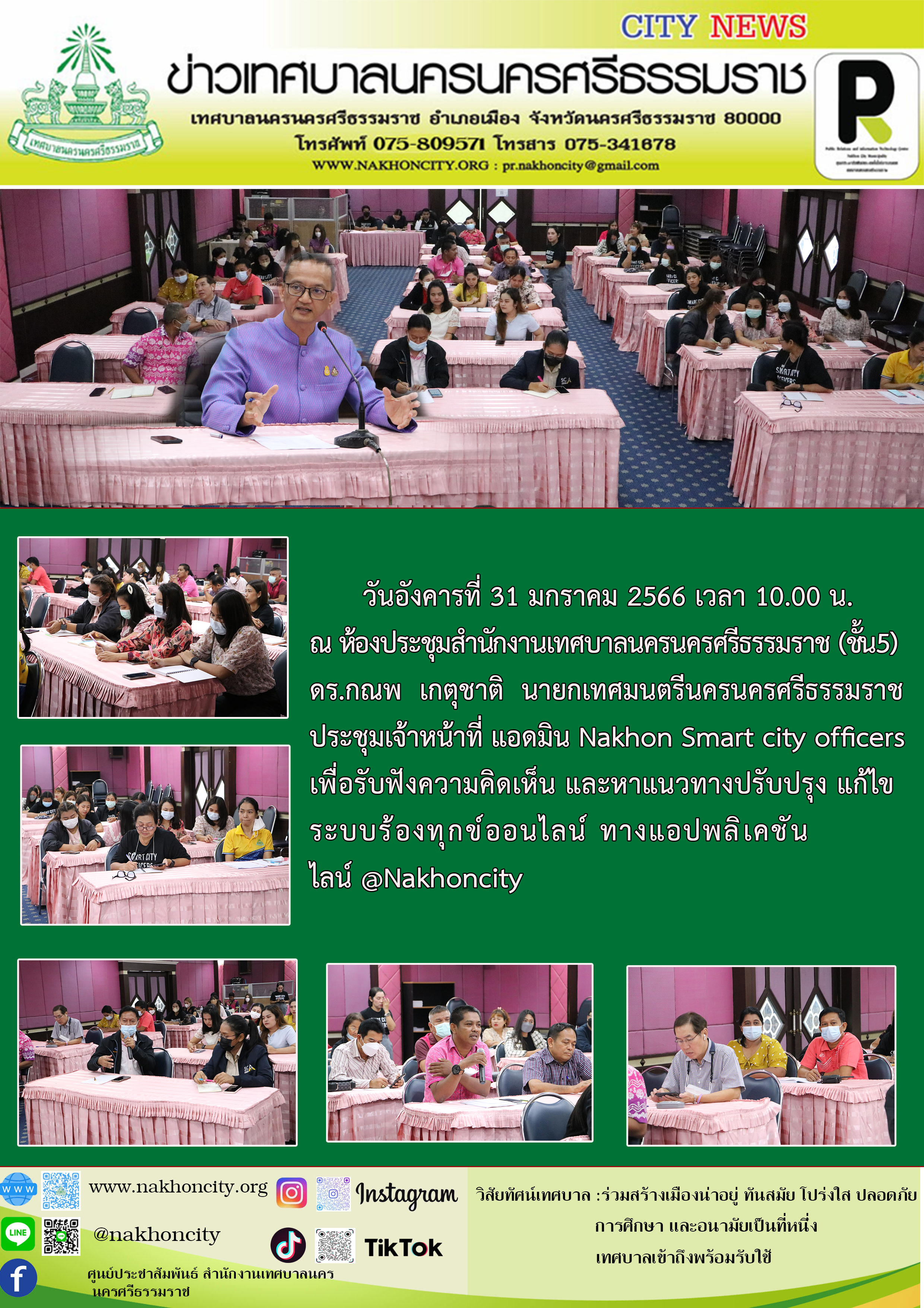 วันอังคารที่ 31 มกราคม 2566 เวลา 10.00 น. ณ ห้องประชุมสำนักงานเทศบาลนครนครศรีธรรมราช (ชั้น5) ดร.กณพ เกตุชาติ นายกเทศมนตรีนครนครศรีธรรมราช ประชุมเจ้าหน้าที่ แอดมิน Nakhon Smart city officers เพื่อรับฟังความคิดเห็น และหาแนวทางปรับปรุง แก้ไขระบบร้องทุกข์ออนไลน์ ทางแอปพลิเคชัน ไลน์ @Nakhoncity ภาพ//ข่าว//ไกรสิทธิ |