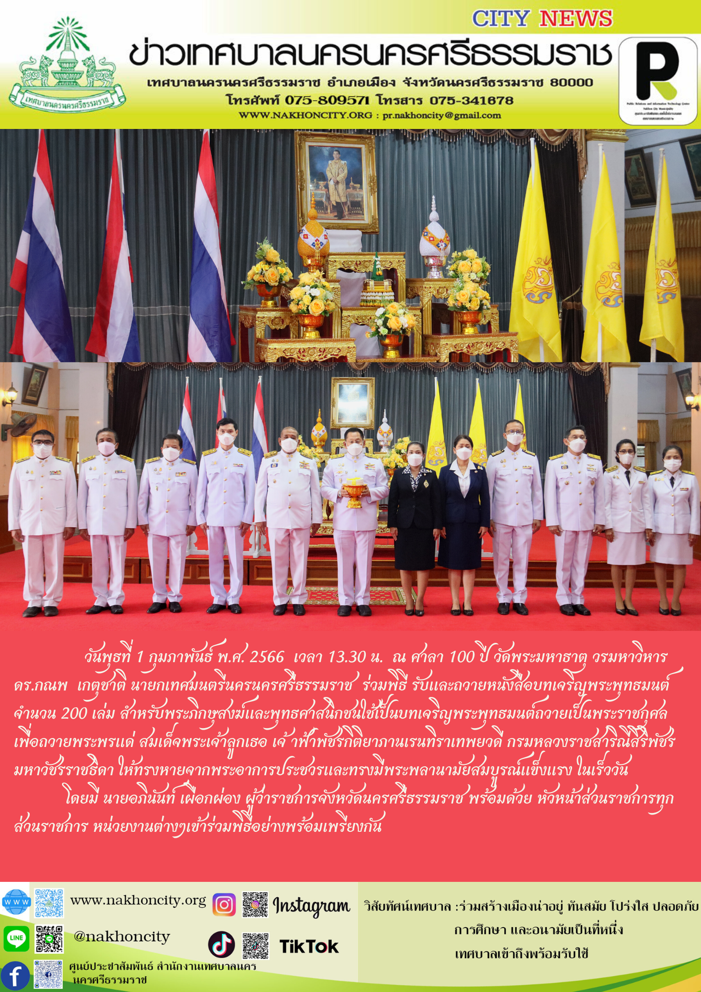 ดร.กณพ เกตุชาติ นายกเทศมนตรีนครนครศรีธรรมราช ร่วมพิธี รับและถวายหนังสือบทเจริญพระพุทธมนต์ จำนวน 200 เล่ม |