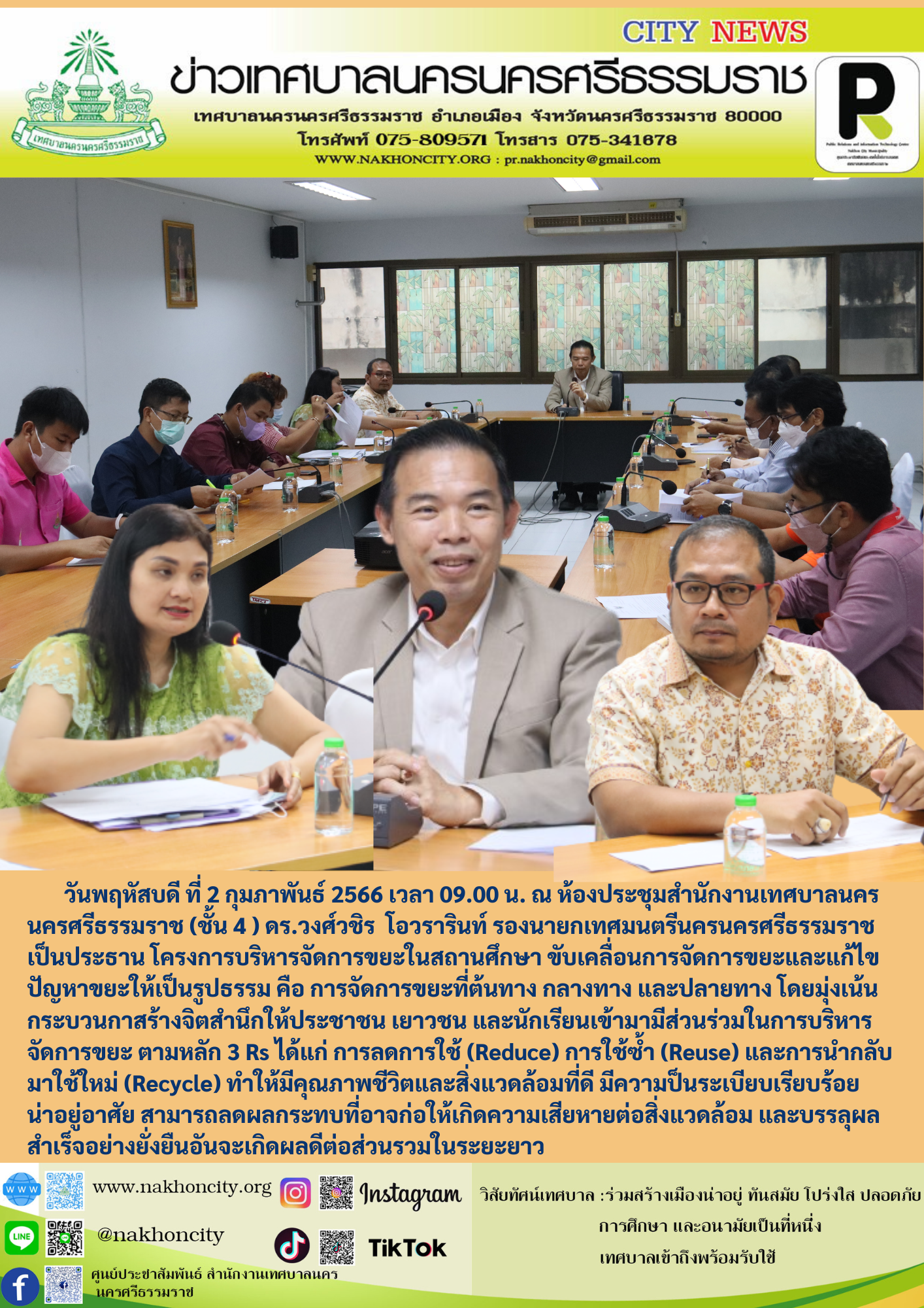 วันพฤหัสบดี ที่ 2 กุมภาพันธ์ 2566 เวลา 09.00 น. ณ ห้องประชุมสำนักงานเทศบาลนครนครศรีธรรมราช (ชั้น 4 ) ดร.วงศ์วชิร โอวรารินท์ รองนายกเทศมนตรีนครนครศรีธรรมราช เป็นประธาน โครงการบริหารจัดการขยะในสถานศึกษา ขับเคลื่อนการจัดการขยะและแก้ไขปัญหาขยะให้เป็นรูปธรรม คือ การจัดการขยะที่ต้นทาง กลางทาง และปลายทาง โดยมุ่งเน้นกระบวนกาสร้างจิตสำนึกให้ประชาชน เยาวชน และนักเรียนเข้ามามีส่วนร่วมในการบริหารจัดการขยะ ตามหลัก 3 Rs ได้แก่ การลดการใช้ (Reduce) การใช้ซ้ำ (Reuse) และการนำกลับมาใช้ใหม่ (Recycle) ทำให้มีคุณภาพชีวิตและสิ่งแวดล้อมที่ดี มีความป็นระเบียบเรียบร้อย น่าอยู่อาศัย สามารถลดผลกระทบที่อาจก่อให้เกิดความเสียหายต่อสิ่งแวดล้อม และบรรลุผลสำเร็จอย่างยั่งยืนอันจะเกิดผลดีต่อส่วนรวมในระยะยาว