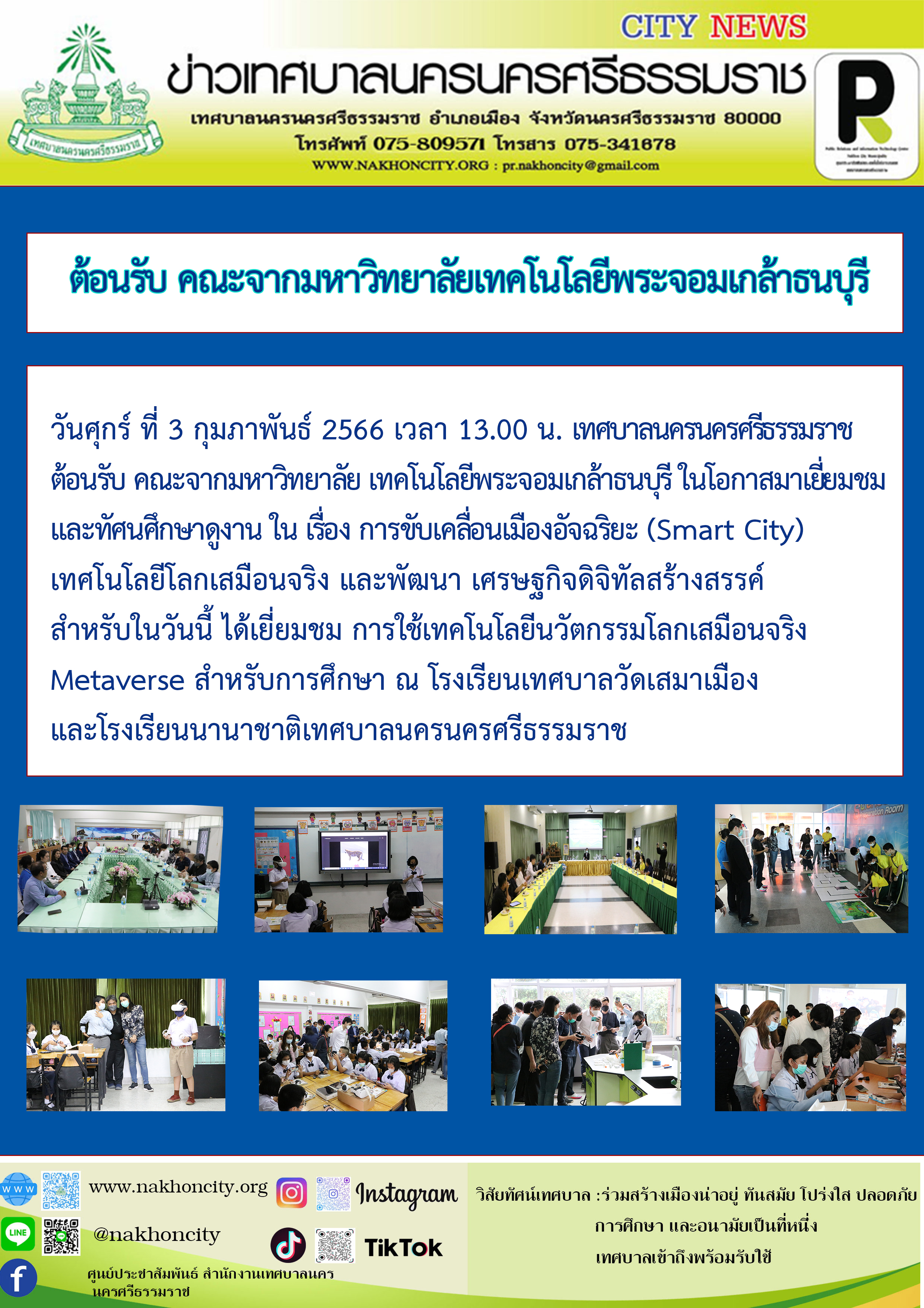 วันศุกร์ ที่ 3 กุมภาพันธ์ 2566 เวลา 13.00 น. เทศบาลนครนครศรีธรรมราช ต้อนรับคณะจากมหาวิทยาลัยเทคโนโลยีพระจอมเกล้าธนบุรี ในโอกาสมาเยี่ยมชม และทัศนศึกษาดูงาน ใน เรื่อง การขับเคลื่อนเมืองอัจฉริยะ (Smart City) เทศโนโลยีโลกเสมือนจริง และพัฒนาเศรษฐกิจดิจิทัลสร้างสรรค์ สำหรับในวันนี้ ได้เยี่ยมชม การใช้เทคโนโลยีนวัตกรรมโลกเสมือนจริง Metaverse สำหรับการศึกษา ณ โรงเรียนเทศบาลวัดเสมาเมือง และโรงเรียนนานาชาติเทศบาลนครนครศรีธรรมราช