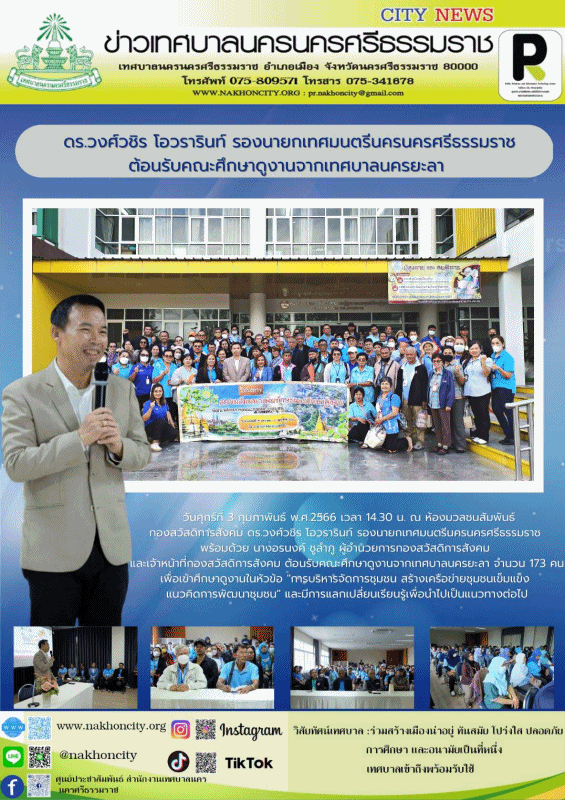ดร.วงศ์วชิร โอวรารินท์ รองนายกเทศมนตรีนครนครศรีธรรมราช ต้อนรับคณะศึกษาดูงานจากเทศบาลนครยะลา |