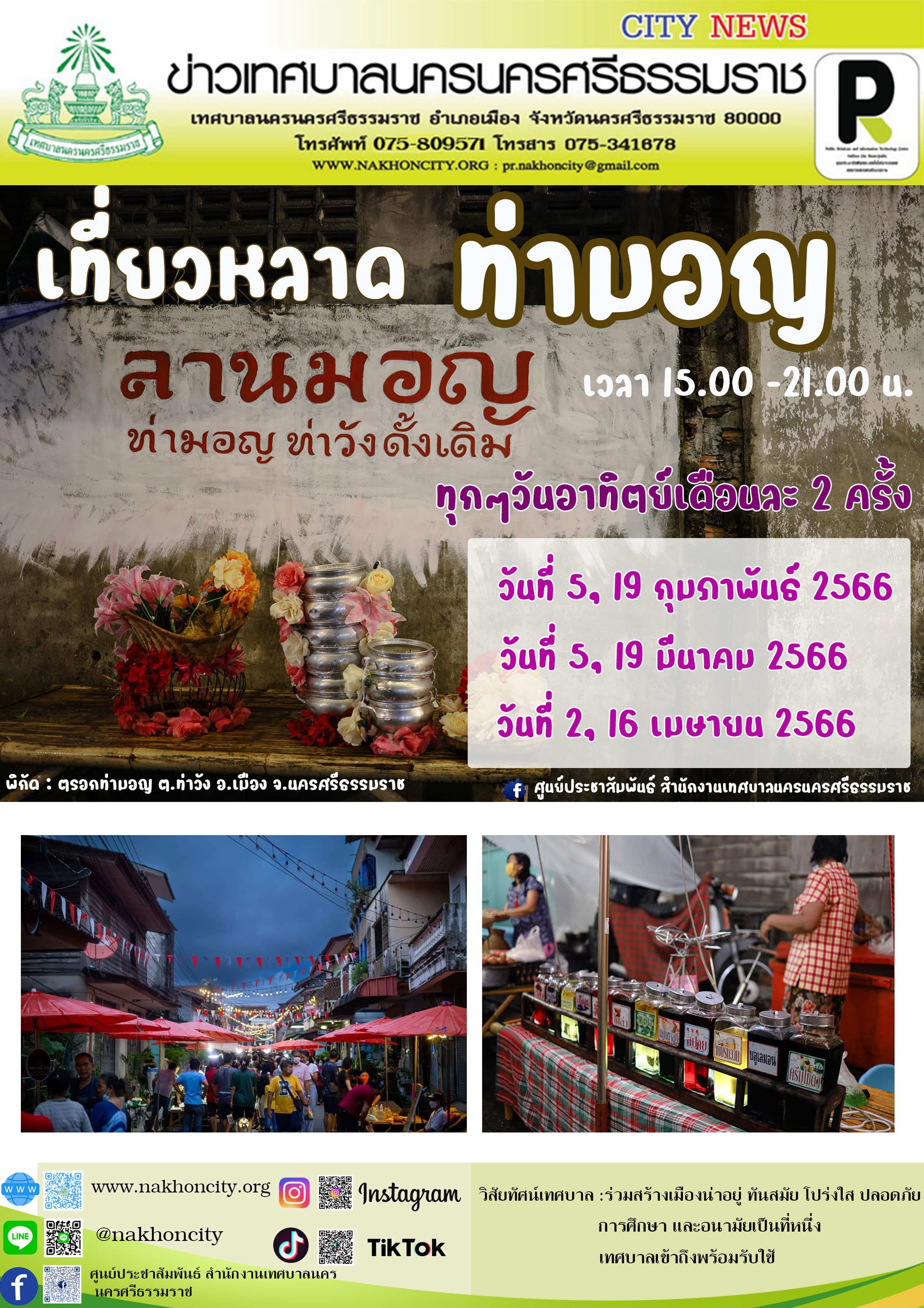 เทศบาลนครนครศรีธรรมราช ขอเชิญเที่ยวงาน “ตลาดท่ามอญ” ชุมชนเก่าแก่กลางเมืองนครศรีธรรมราช ตลาดชุมชนแบบดั้งเดิม ณ ตรอกท่ามอญ บริเวณเชิงสะพานราเมศวร์ ถนนคนเดิน แนวยาวไปจนถึงวัดศรีทวี หลาดท่ามอญเป็นการขับเคลื่อนเศรษฐกิจและสังคมฐานราก เป็นความรับผิดชอบของ มหาวิทยาลัยราชภัฎนครศรีธรรมราช จัดขึ้นเพื่อให้เป็นแหล่งท่องเที่ยว สามารถสร้างรายได้แก่ชุมชนทุกเพศทุกวัย มีภาพศิลปะ มุมถ่ายภาพสวยงามเต็มไปด้วยกลิ่นอายวัฒนธรรมดั้งเดิมชุมชนชาวมอญ มีของกิน ของใช้ให้เลือกมากมายที่ชาวบ้านได้นำมาจำหน่าย และมีการแสดงพื้นเมืองของเยาวชนในชุมชน การแสดงดนตรี/ศิลปะร่วมสมัยของเยาวชน นิทรรศการ และยังมีจุดเช็คอิน เซลฟี่กับกำแพงงานศิลปะสุดว๊าว ร่วมย้อนรำลึกถึงชุมชนโบราณจากเรื่องเล่าของคนท่ามอญ สายกิน สายแช๊ะ และสายอาร์ตอีกด้วย “หลาดท่ามอญ” ท่าวัง เปิดทุกวันอาทิตย์ (เดือนละ 2 ครั้ง) ตั้งแต่เวลา 15.00 -22.00 น. วันที่ 5,19 กุมภาพันธ์ 2566 วันที่ 5, 19 มีนาคม 2566 วันที่ 2, 16 เมษายน 2566 ............... ข่าว//จันทร์จิรา อินโฟ//สิริญญา |
