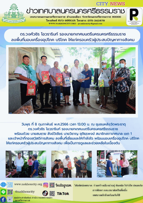 ดร.วงศ์วชิร โอวรารินท์ รองนายกเทศมนตรีนครนครศรีธรรมราช ลงพื้นที่มอบเครื่องอุปโภค บริโภค ให้แก่ครอบครัวผู้ประสบปัญหาทางสังคม |