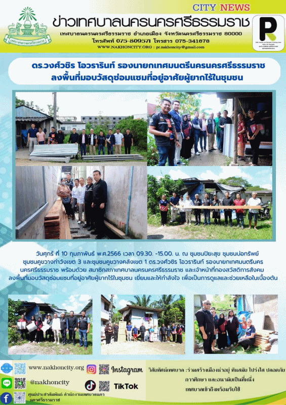 ดร.วงศ์วชิร โอวรารินท์ รองนายกเทศมนตรีนครนครศรีธรรมราช ลงพื้นที่มอบวัสดุซ่อมแซมที่อยู่อาศัยผู้ยากไร้ในชุมชน |
