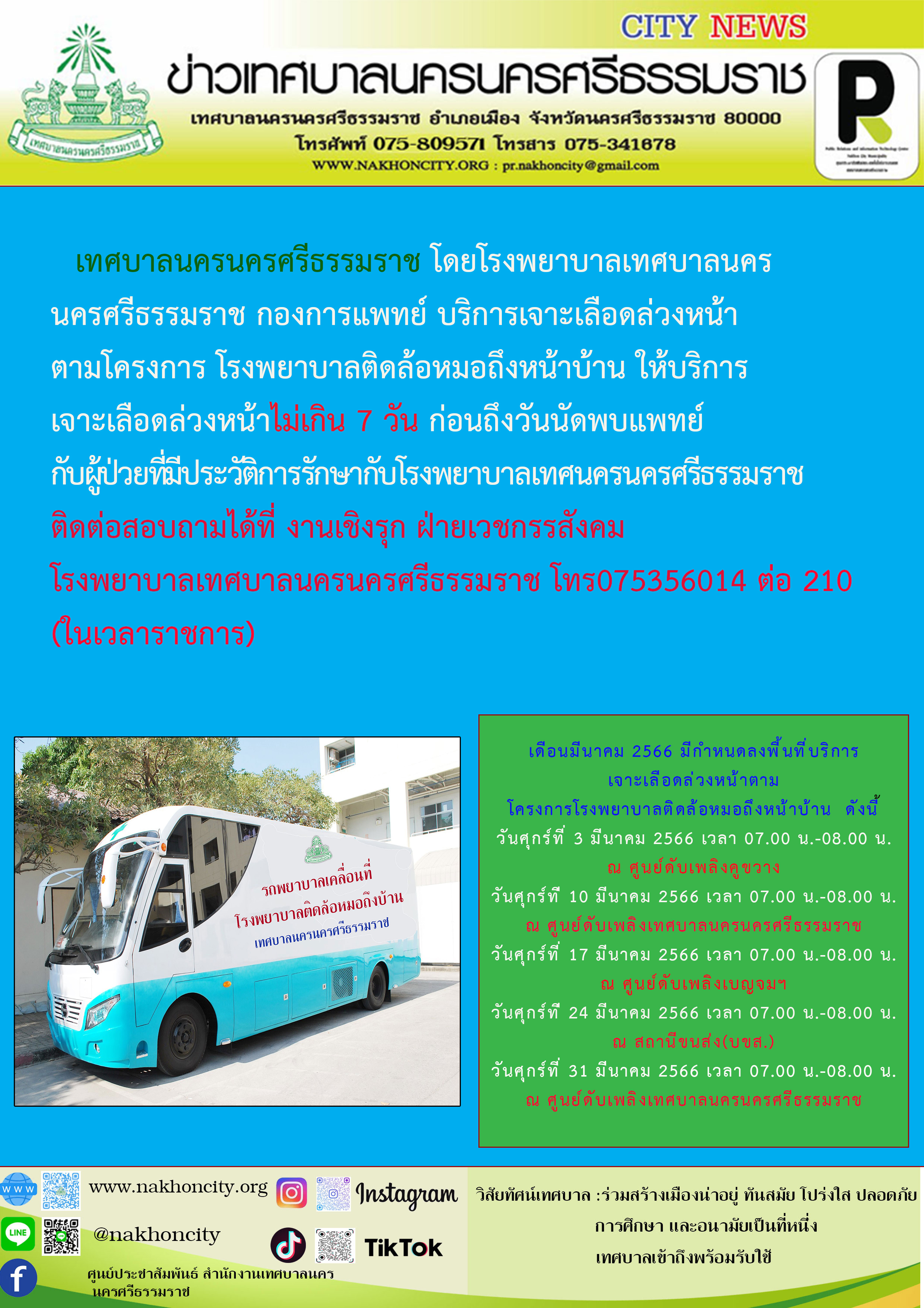 เทศบาลนครนครศรีธรรมราช โดยโรงพยาบาลเทศบาลนครนครศรีธรรมราช กองการแพทย์ บริการเจาะเลือดล่วงหน้า ตามโครงการโรงพยาบาลติดล้อหมอถึงหน้าบ้าน ให้บริการเจาะเลือดล่วงหน้าไม่เกิน 7 วัน ก่อนถึงวันนัดพบแพทย์ กับผู้ป่วยที่มีประวัติการรักษากับโรงพยาบาลเทศบาลนครนครศรีธรรมราช ซึ่งในเดือนมีนาคม 2566 มีกำหนดลงพื้นที่บริการ เจาะเลือดล่วงหน้า ตามโครงการโรงพยาบาลติดล้อหมอถึงหน้าบ้าน ดังนี้