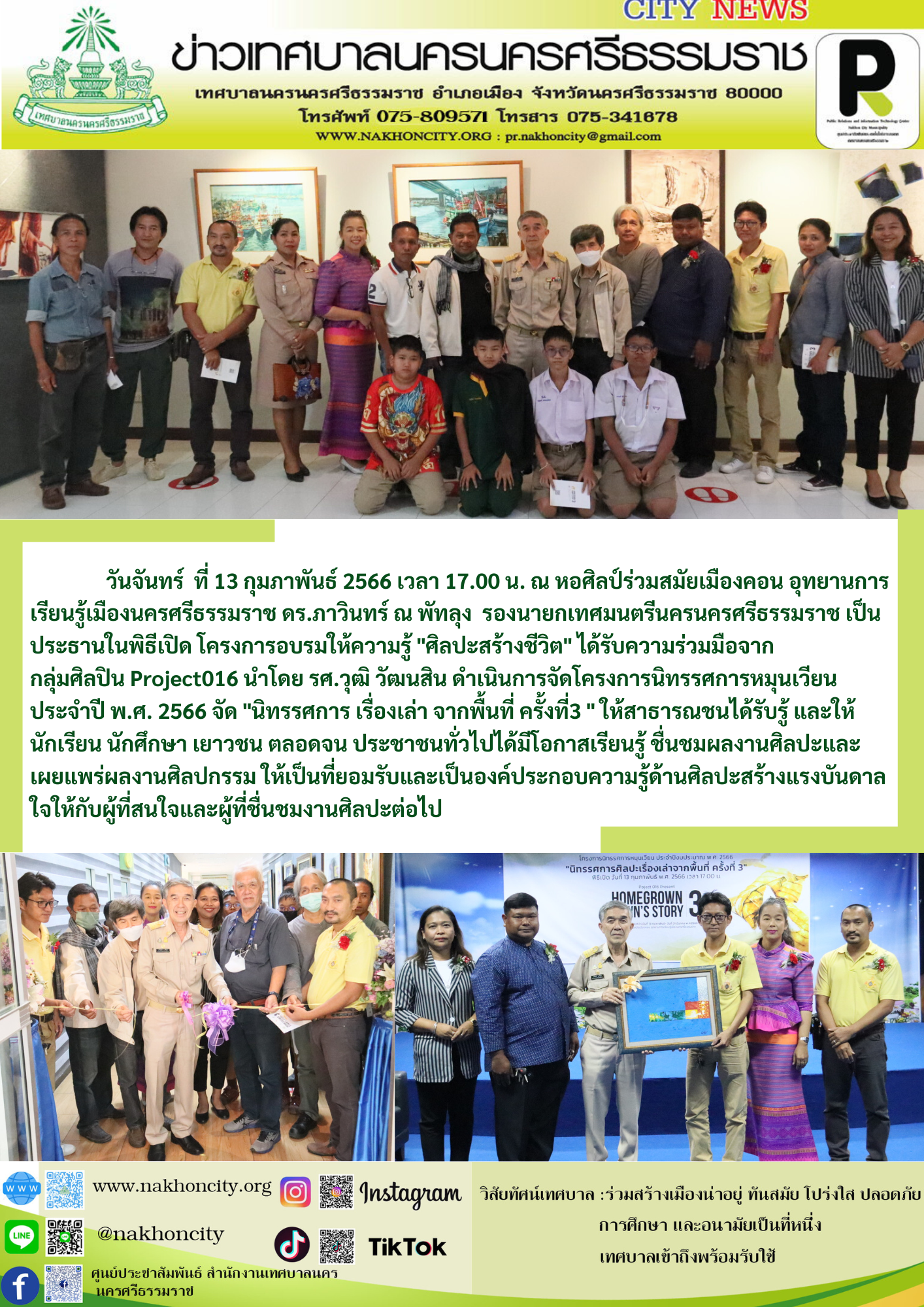 วันจันทร์ที่ 13 กุมภาพันธ์ 2566 เวลา 17.00 น. ณ หอศิลป์ร่วมสมัยเมืองคอน อุทยานการเรียนรู้เมืองนครศรีธรรมราช ดร.ภาวินทร์ ณ พัทลุง รองนายกเทศมนตรีนครนครศรีธรรมราช เป็นประธานในพิธีเปิด โครงการอบรมให้ความรู้ "ศิลปะสร้างชีวิต" ได้รับความร่วมมือจาก กลุ่มศิลปิน Project016 นำโดย รศ.วุฒิ วัฒนสิน ดำเนินการจัดโครงการนิทรรศการหมุนเวียน ประจำปี พ.ศ. 2566 จัด"นิทรรศการ เรื่องเล่า จากพื้นที่ ครั้งที่3" ให้สาธารณชนได้รับรู้ และให้นักเรียน นักศึกษา เยาวชน ตลอดจน ประชาชนทั่วไปได้มีโอกาสเรียนรู้ ชื่นชมผลงานศิลปะและเผยแพร่ผลงานศิลปกรรม ให้เป็นที่ยอมรับและเป็นองค์ประกอบความรู้ด้านศิลปะสร้างแรงบันดาลใจให้กับผู้ที่สนใจ และผู้ที่ชื่นชมงานศิลปะต่อไป |