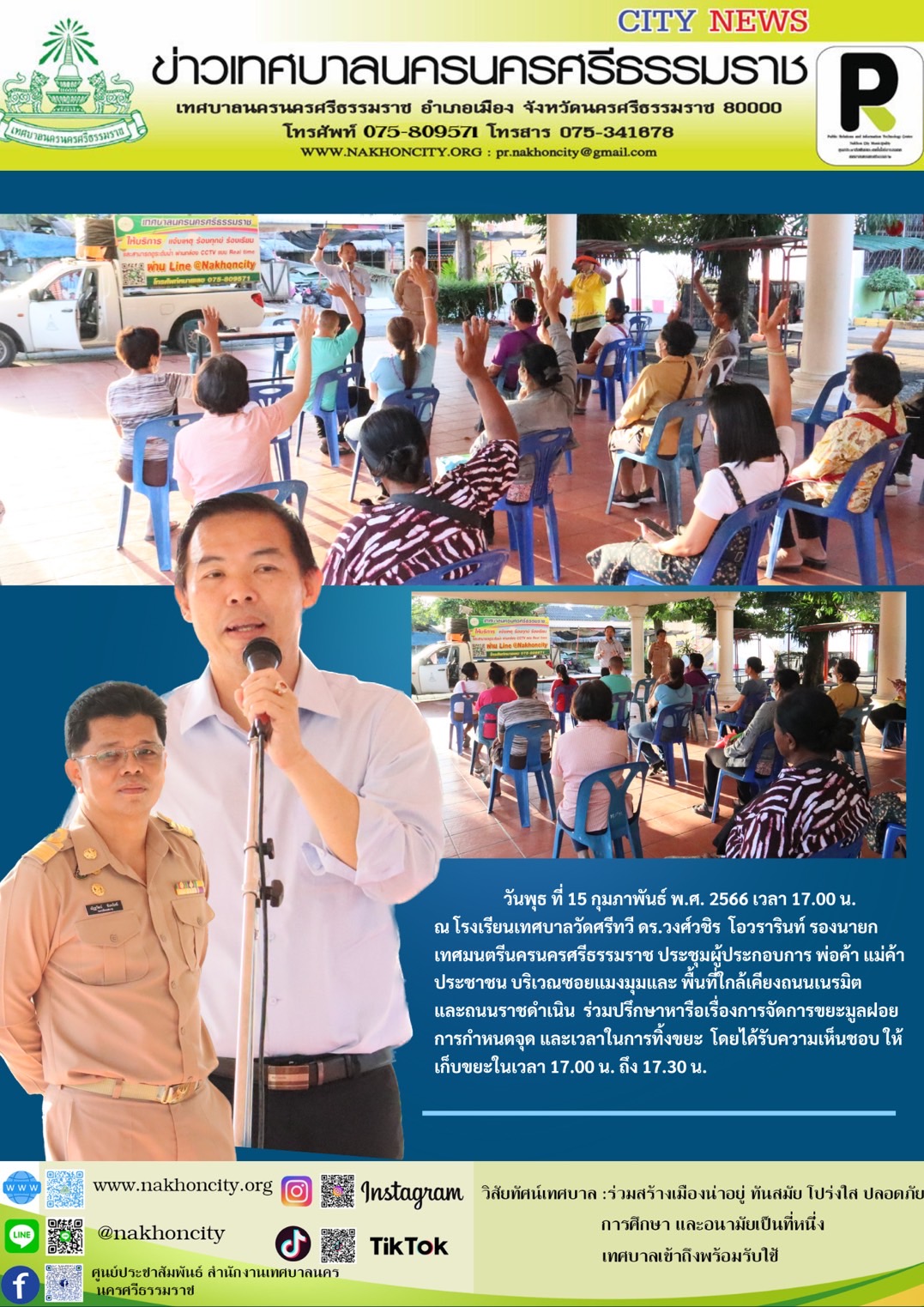 วันพุธ ที่ 15 กุมภาพันธ์ พ.ศ. 2566 เวลา 17.00 น. ณ โรงเรียนเทศบาลวัดศรีทวี ดร.วงศ์วชิร โอวรารินท์ รองนายกเทศมนตรีนครนครศรีธรรมราช ประชุมผู้ประกอบการ พ่อค้า แม่ค้า ประชาชน บริเวณซอยแมงมุมและ พื้นที่ใกล้เคียงถนนเนรมิต และถนนราชดำเนิน ร่วมปรึกษาหารือเรื่องการจัดการขยะมูลฝอย การกำหนดจุด และเวลาในการทิ้งขยะ โดยได้รับความเห็นชอบ ให้เก็บขยะในเวลา 17.00 น. ถึง 17.30 น.