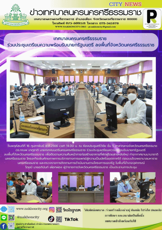 วันพฤหัสบดีที่ 16 กุมภาพันธ์ พ.ศ.2566 เวลา 14.00 น. ณ ห้องประชุมศรีวิชัย ชั้น 5 ศาลากลางจังหวัดนครศรีธรรมาช ดร.กณพ เกตุชาติ นายกเทศมนตรีนครนครศรีธรรมราช พร้อมด้วยนายวีรศักดิ์ รับไทรทอง เลขานุการนายกเทศมนตรีนครนครศรีธรรมราช ร่วมประชุมเตรียมความพร้อมรับนายกรัฐมนตรี ลงพื้นที่จังหวัดนครศรีธรรมราช เพื่อติดตามความคืบหน้าการก่อสร้างอาคารที่พักผู้โดยสารหลังใหม่ ท่าอากาศยานนานาชาตินครศรีธรรมราช โครงการเพิ่มศักยภาพการบริการทางการแพทย์สู่ความเป็นเลิศในเขตภาคใต้ ตอนบนโรงพยาบาลมหาราชนครศรีธรรมราช และตรวจราชการติดตามการดำเนินงานตามโครงการของรัฐ ในพื้นที่อำเภอจุฬาภรณ์ |