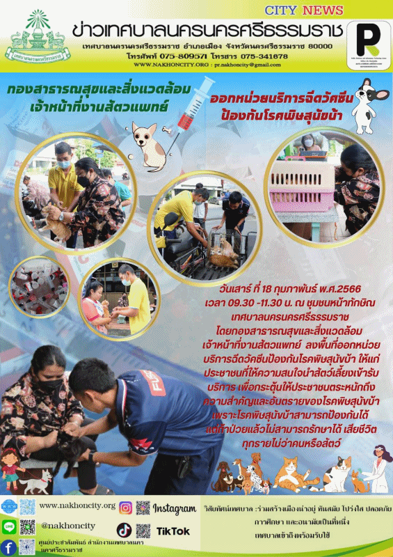 วันเสาร์ ที่ 18 กุมภาพันธ์ พ.ศ.2566 เวลา 09.30 -11.30 น. ณ ชุมชนหน้าทักษิณ เทศบาลนนครศรีธรรมราช โดยกองสาธารณสุขและสิ่งแวดล้อม เจ้าหน้าที่งานสัตวแพทย์ ลงพื้นที่ออกหน่วยบริการฉีดวัคซีนป้องกันโรคพิษสุนัขบ้า ให้แก่ประชาชนที่ให้ความสนใจนำสัตว์เลี้ยงเข้ารับบริการ เพื่อกระตุ้นให้ประชาชนตระหนักถึงความสำคัญและอันตรายของโรคพิษสุนัขบ้า เพราะโรคพิษสุนัขบ้าสามารถป้องกันได้ แต่ถ้าป่วยแล้วไม่สามารถรักษาได้ เสียชีวิตทุกรายไม่ว่าคนหรือสัตว์ ซึ่งในวันนี้มีประชาชนทยอยนำสัตว์เลี้ยง สุนัขและแมว มาลงทะเบียนแจ้งชื่อ อายุของสัตว์เลี้ยงรับบริการฉีดวัคซีนป้องกันโรคพิษสุนัขบ้า รับใบรับรองและป้ายโลหะไปคล้องคอสัตว์เลี้ยง สามารถติดต่อสอบถามได้ที่สถานพยาบาลสัตว์ทุ่งท่าลาด โทร.075 358292 ( วัน-เวลาราชการ ) ................... ภาพ//ข่าว//จันทร์จิรา |
