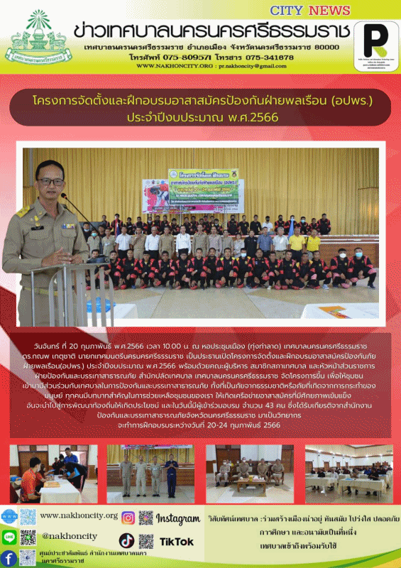 วันจันทร์ ที่ 20 กุมภาพันธ์ พ.ศ.2566 เวลา 10.00 น. ณ หอประชุมเมือง (ทุ่งท่าลาด) เทศบาลนครนครศรีธรรมราช ดร.กณพ เกตุชาติ นายกเทศมนตรีนครนครศรีธรรมราช เป็นประธานเปิดโครงการจัดตั้งและฝึกอบรมอาสาสมัครป้องกันภัยฝ่ายพลเรือน(อปพร.) ประจำปีงบประมาณ พ.ศ.2566 พร้อมด้วยคณะผู้บริหาร สมาชิกสภาเทศบาล และหัวหน้าส่วนราชการ ฝ่ายป้องกันและบรรเทาสาธารณภัย สำนักปลัดเทศบาล เทศบาลนครนครศรีธรรมราช จัดโครงการขึ้น เพื่อให้ชุมชนเข้ามามีส่วนร่วมกับเทศบาลในการป้องกันและบรรเทาสาธารณภัย ทั้งที่เป็นภัยจากธรรมชาติหรือภัยที่เกิดจากการกระทำของมนุษย์ ทุกคนมีบทบาทสำคัญในการช่วยเหลือชุมชนของเรา ให้เกิดเครือข่ายอาสาสมัครที่มีศักยภาพเข้มแข็ง อันจะนำไปสู่การพัฒนาท้องถิ่นให้เกิดประโยชน์ และในวันนี้มีผู้เข้าร่วมอบรม จำนวน 43 คน ซึ่งได้รับเกียรติจากสำนักงานป้องกันและบรรเทาสาธารณภัยจังหวัดนครศรีธรรมราช มาเป็นวิทยากร จะทำการฝึกอบรมระหว่างวันที่ 20-24 กุมภาพันธ์ 2566 .................... ภาพ//ข่าว//จันทร์จิรา |