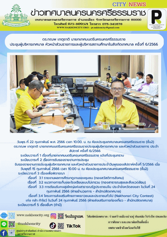 ดร.กณพ เกตุชาติ นายกเทศมนตรีนครนครศรีธรรมราช ประชุมผู้บริหารเทศบาล หัวหน้าส่วนราชการและผู้บริหารสถานศึกษาในสังกัดเทศบาล ครั้งที่ 6/2566 |