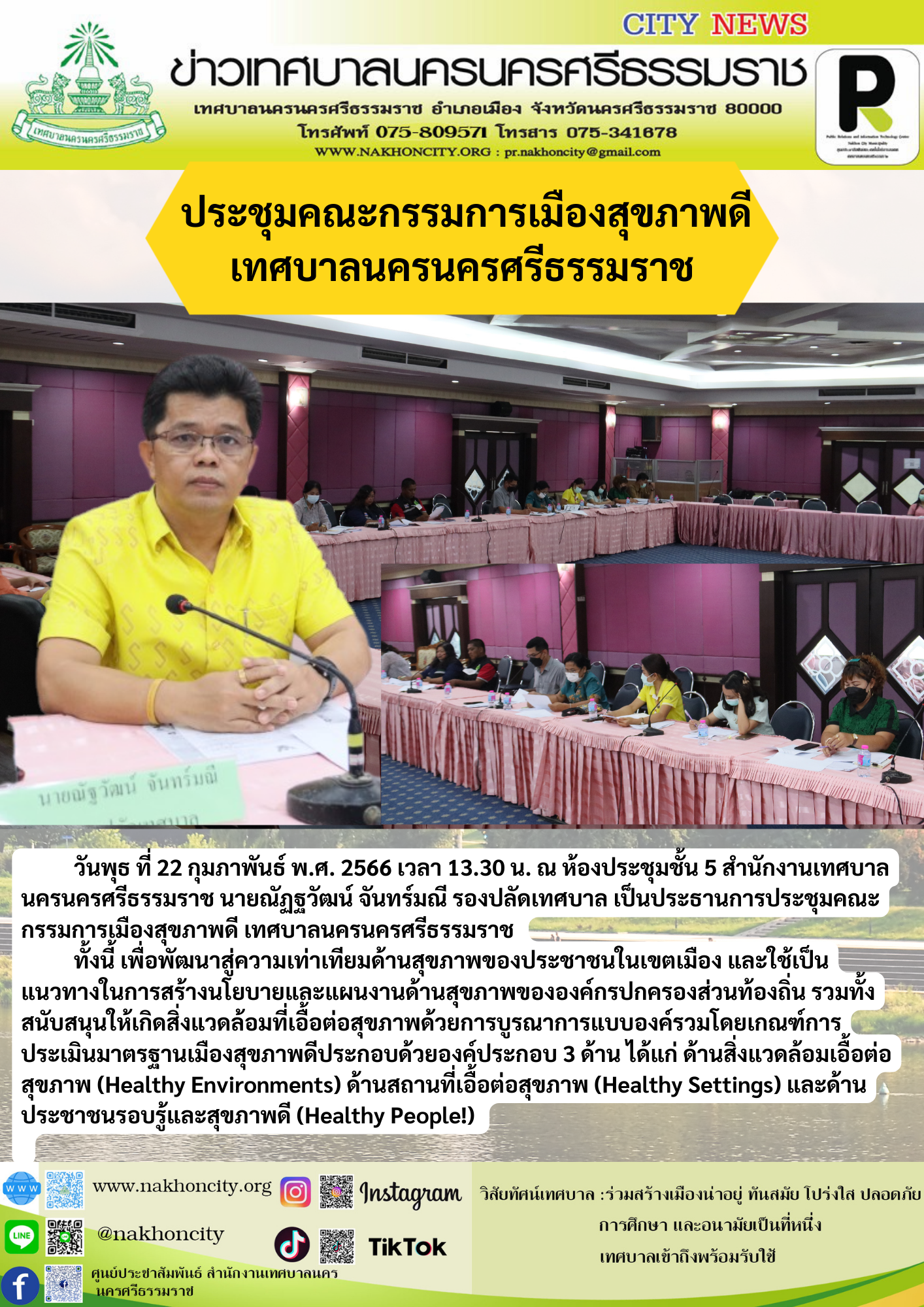 วันพุธที่ 22 กุมภาพันธ์ พ.ศ. 2566 เวลา 13.30 น. ณ ห้องประชุมชั้น 5 สำนักงานเทศบาลนครนครศรีธรรมราช นายณัฏฐวัฒน์ จันทร์มณี รองปลัดเทศบาล เป็นประธานการประชุมคณะกรรมการเมืองสุขภาพดี เทศบาลนครนครศรีธรรมราช ทั้งนี้ เพื่อพัฒนาสู่ความเท่าเทียมด้านสุขภาพของประชาชนในเขตเมือง และใช้เป็นแนวทางในการสร้างนโยบายและแผนงานด้านสุขภาพขององค์กรปกครองส่วนท้องถิ่น รวมทั้งสนับสนุนให้เกิดสิ่งแวดล้อมที่เอื้อต่อสุขภาพด้วยการบูรณาการแบบองค์รวมโดยเกณฑ์การประเมินมาตรฐานเมืองสุขภาพดีประกอบด้วยองค์ประกอบ 3 ด้าน ได้แก่ ด้านสิ่งแวดล้อมเอื้อต่อสุขภาพ (Healthy Environments) ด้านสถานที่เอื้อต่อสุขภาพ (Healthy Settings) และด้านประชาชนรอบรู้และสุขภาพดี (Healthy People!)