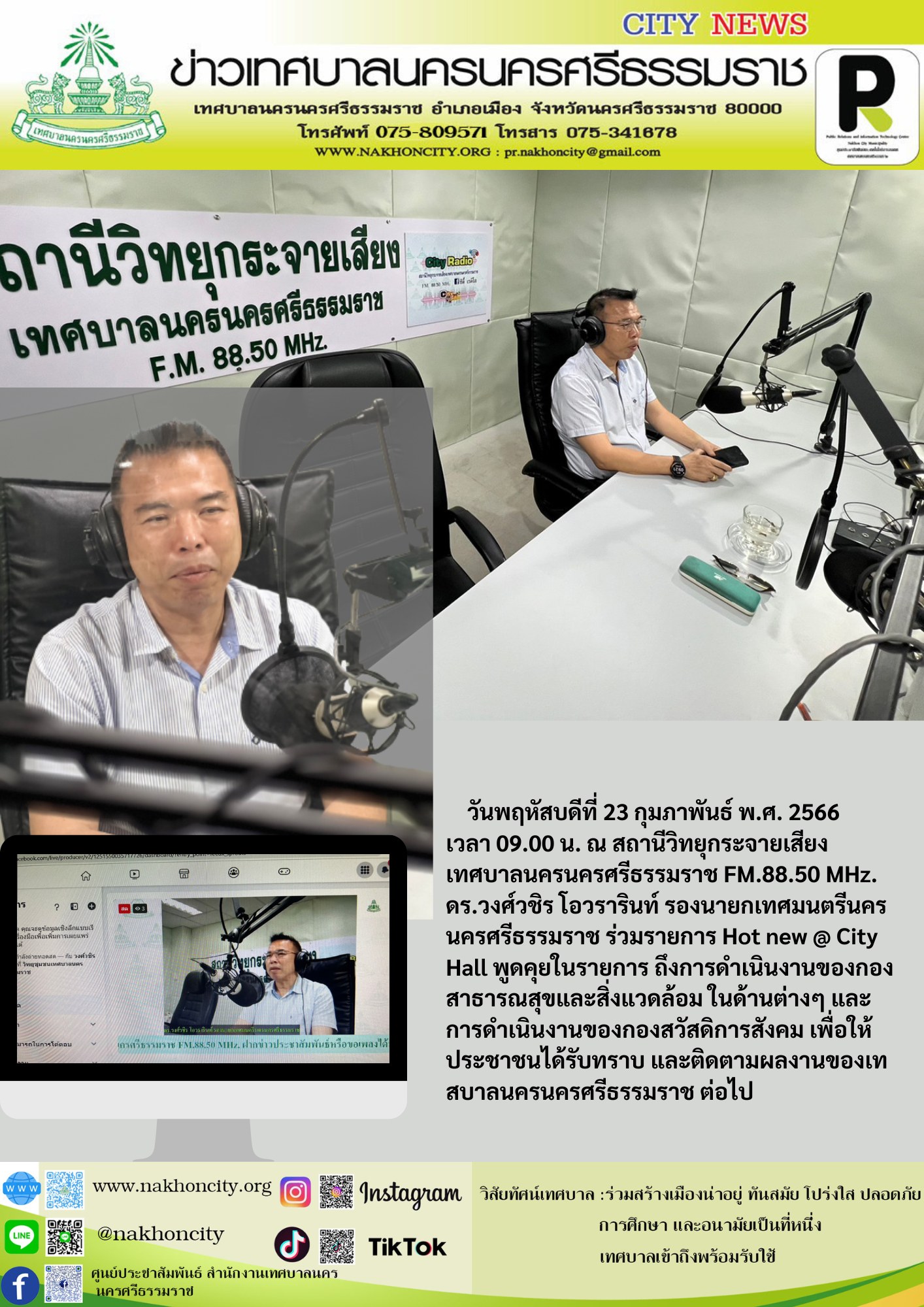 ดร.วงศ์วชิร โอวรารินท์ รองนายกเทศมนตรีนครนครศรีธรรมราช ร่วมรายการ Hot new @ City Hall ทางสถานีวิทยุกระจายเสียง เทศบาลนครนครศรีธรรมราช FM.88.50 MHz. |
