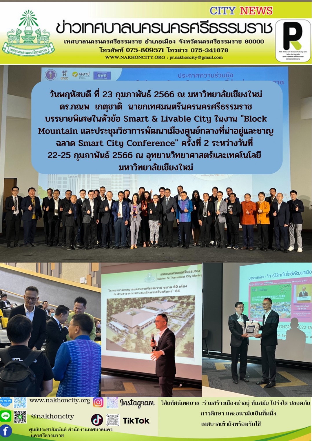 นายกเทศมนตรีนครนครศรีธรรมราช บรรยายพิเศษในหัวข้อ Smart & Livable City ในงาน "Block Mountain และประชุมวิชาการพัฒนาเมืองศูนย์กลางที่น่าอยู่และชาญฉลาด Smart City Conference" ครั้งที่ 2 ระหว่างวันที่ 22-25 กุมภาพันธ์ 2566 ณ อุทยานวิทยาศาสตร์และเทคโนโลยี มหาวิทยาลัยเชียงใหม่ |