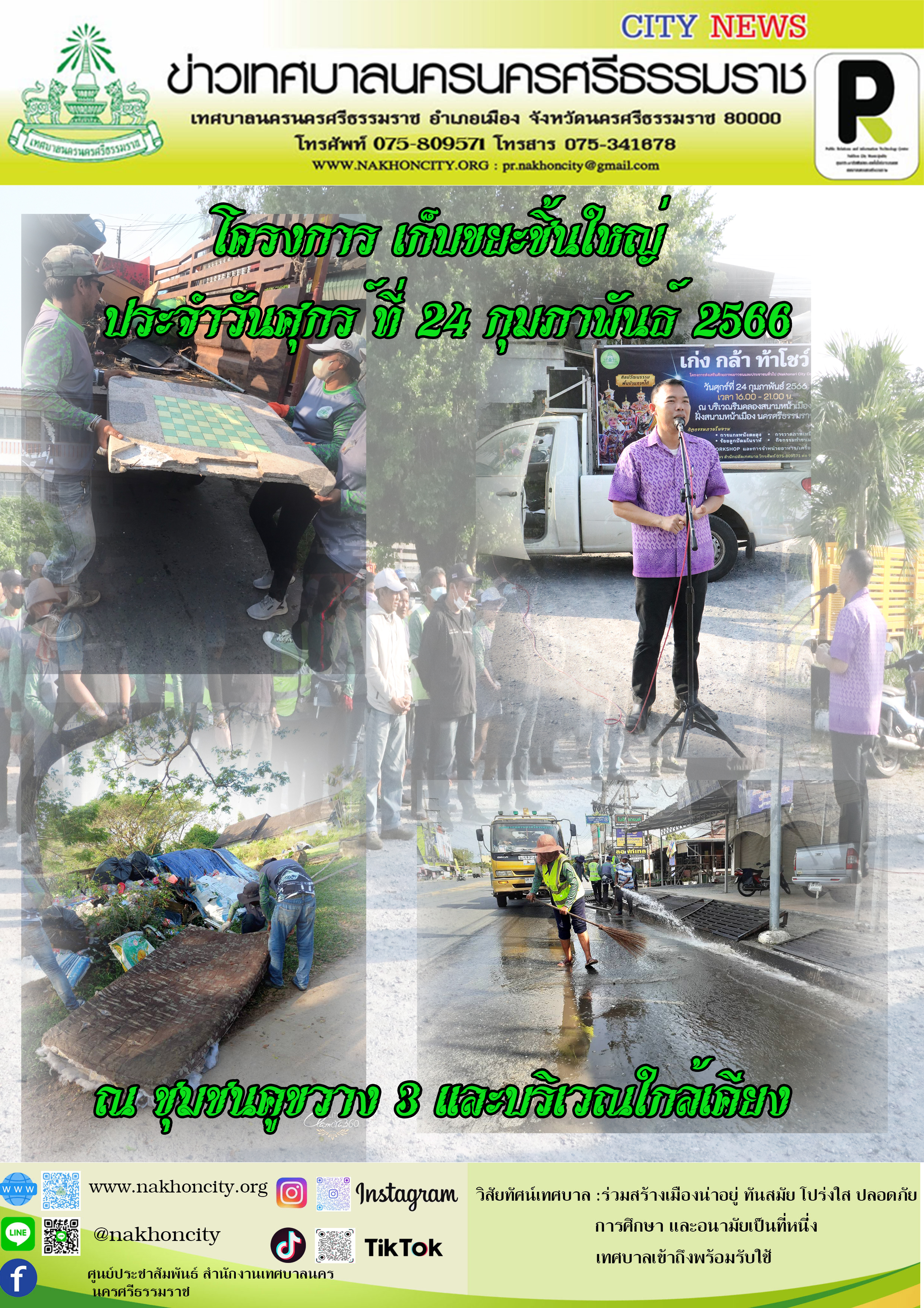 วันศุกร์ที่ 24 กุมภาพันธ์ พ.ศ. 2566 เวลา 07.30 น. เจ้าหน้าที่กองสาธารณสุขและสิ่งแวดล้อมเทศบาลนครนครศรีธรรมราช ลงพื้นที่พัฒนา เก็บขยะชิ้นใหญ่ สิ่งของชำรุดเศษวัสดุ อาทิ ที่นอนขนาดใหญ่ เตียง โต๊ะ เก้าอี้ พร้อมทั้ง เก็บกวาดขยะทั่วไป ตัดหญ้า และฉีดล้างถนน ณ ชุมชนคูขวาง 3 และบริเวณใกล้เคียง เพื่อความสะอาด สวยงาม และเป็นระเบียบเรียบร้อยของชุมชน