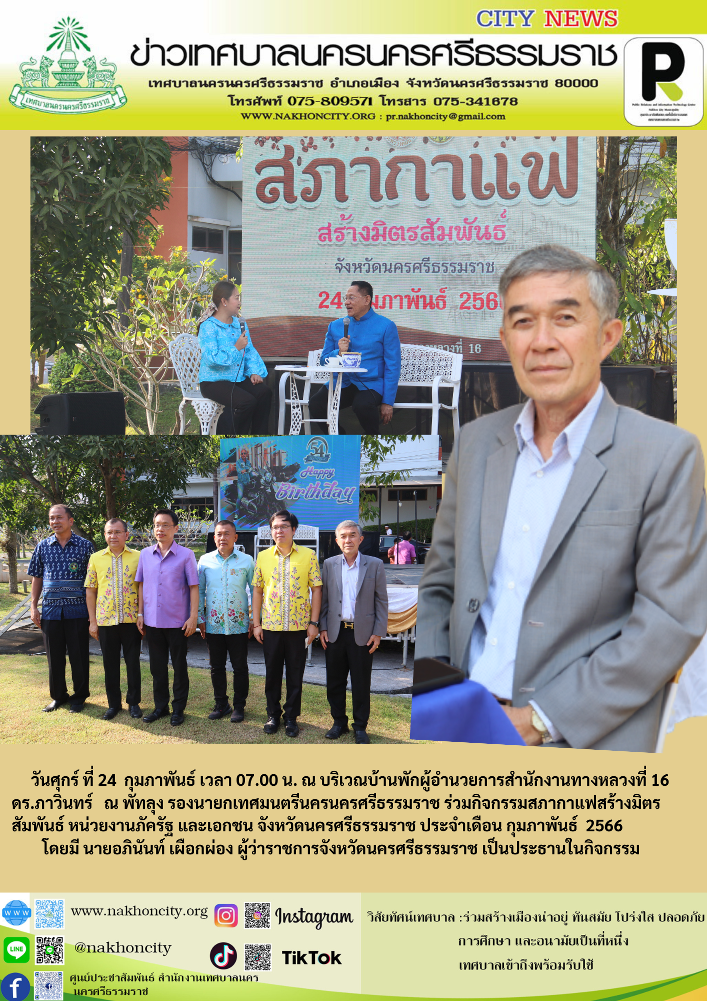 ดร.ภาวินทร์ ณ พัทลุง รองนายกเทศมนตรีนครนครศรีธรรมราช ร่วมกิจกรรมสภากาแฟสร้างมิตรสัมพันธ์ หน่วยงานภัครัฐ และเอกชน จังหวัดนครศรีธรรมราช ประจำเดือน กุมภาพันธ์ 2566 |