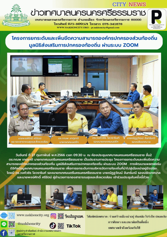 วันจันทร์ ที่ 27 กุมภาพันธ์ พ.ศ.2566 เวลา 09.30 น. ณ ห้องประชุมเทศบาลนครนครศรีธรรมราช ชั้น2 ดร.กณพ เกตุชาติ นายกเทศมนตรีนครนครศรีธรรมราช เป็นประธานการประชุม โครงการยกระดับและเพิ่มขีดความสามารถองค์กรปกครองส่วนท้องถิ่น มูลนิธิส่งเสริมการปกครองท้องถิ่น ผ่านระบบ ZOOM การพัฒนาแพลตฟอร์มดิจิทัลข้อมูลเทศบาลนครนครศรีธรรมราช เพื่อการยกระดับการบริหารจัดการท้องถิ่นที่นำไปสู่เมืองน่าอยู่อัจฉริยะ โดยมี ดร.วงศ์วชิร โอวรารินท์ รองนายกเทศมนตรีนครนครศรีธรรมราช นายณัฏฐวัฒน์ จันทร์มณี รองปลัดเทศบาล และนายพงษ์ศักดิ์ ศรีรัตน์ ผู้อำนวยการกองสาธารณสุขและสิ่งแวดล้อม เข้าร่วมประชุมในครั้งนี้ด้วย ............... ภาพ//ข่าว//จันทร์จิรา |