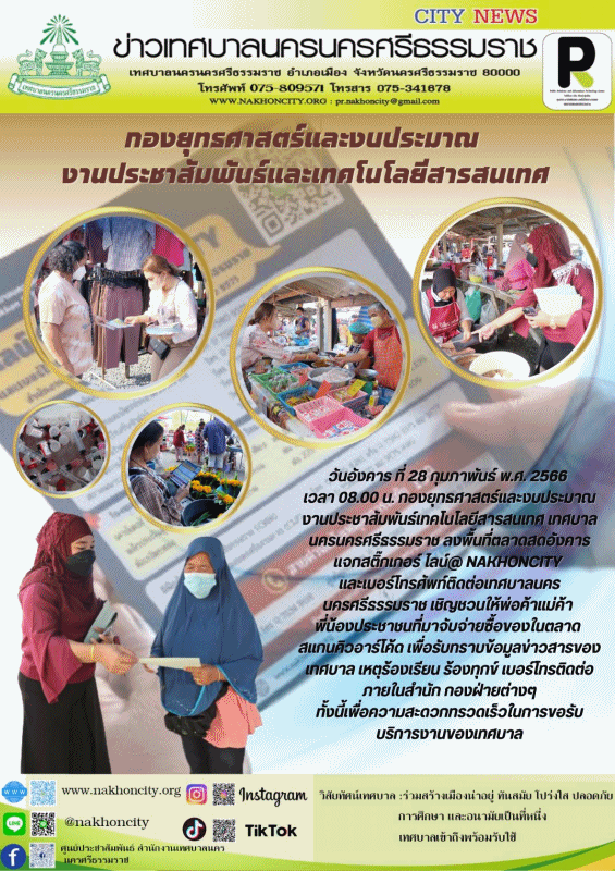วันอังคาร ที่ 28 กุมภาพันธ์ พ.ศ. 2566 เวลา 08.00 น. กองยุทธศาสตร์และงบประมาณ งานประชาสัมพันธ์เทคโนโลยีสารสนเทศ เทศบาลนครนครศรีธรรมราช ลงพื้นที่ตลาดสดอังคาร แจกสติ๊กเกอร์ ไลน์@ NAKHONCITY และเบอร์โทรศัพท์ติดต่อเทศบาลนครนครศรีธรรมราช เชิญชวนให้พ่อค้าแม่ค้า พี่น้องประชาชนที่มาจับจ่ายซื้อของในตลาด สแกนคิวอาร์โค้ด เพื่อรับทราบข้อมูลข่าวสารของเทศบาล เหตุร้องเรียน ร้องทุกข์ เบอร์โทรติดต่อภายในสำนัก กองฝ่ายต่างๆ ทั้งนี้เพื่อความสะดวกทรวดเร็วในการขอรับบริการงานของเทศบาล .............. ภาพ//ข่าว//จันทร์จิรา |