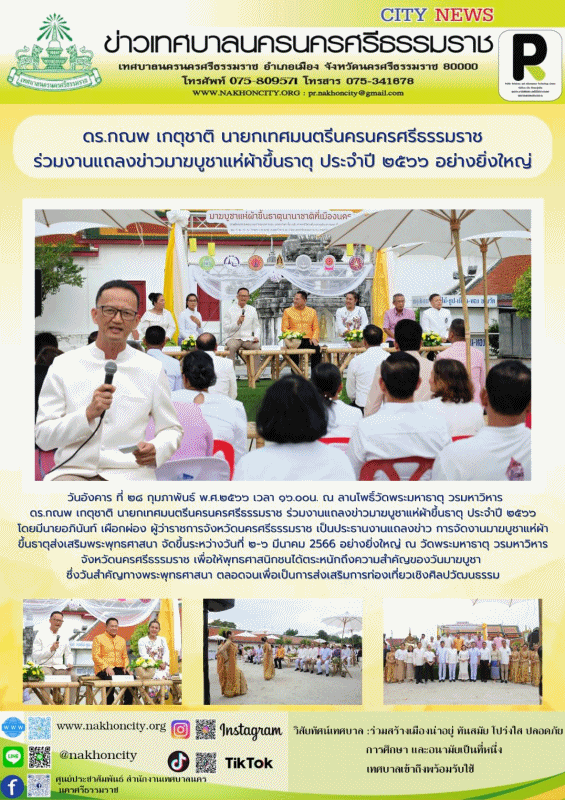 วันอังคาร ที่ 28 กุมภาพันธ์ พ.ศ.2566 เวลา 16.00 น. ณ ลานโพธิ์วัดพระมหาธาตุ วรมหาวิหาร ดร.กณพ เกตุชาติ นายกเทศมนตรีนครนครศรีธรรมราช ร่วมงานแถลงข่าวมาฆบูชาแห่ผ้าขึ้นธาตุ ประจำปี 2566 โดยมีนายอภินันท์ เผือกผ่อง ผู้ว่าราชการจังหวัดนครศรีธรรมราช เป็นประธานงานแถลงข่าว การจัดงานมาฆบูชาแห่ผ้าขึ้นธาตุส่งเสริมพระพุทธศาสนา จัดขึ้นระหว่างวันที่ 2-6 มีนาคม 2566 อย่างยิ่งใหญ่ ณ วัดพระมหาธาตุ วรมหาวิหาร จังหวัดนครศรีธรรมราช เพื่อให้พุทธศาสนิกชนได้ตระหนักถึงความสำคัญของวันมาฆบูชา ซึ่งวันสำคัญทางพระพุทธศาสนา ตลอดจนเพื่อเป็นการส่งเสริมการท่องเที่ยวเชิงศิลปวัฒนธรรม ............ ภาพ//ข่าว//จันทร์จิรา |