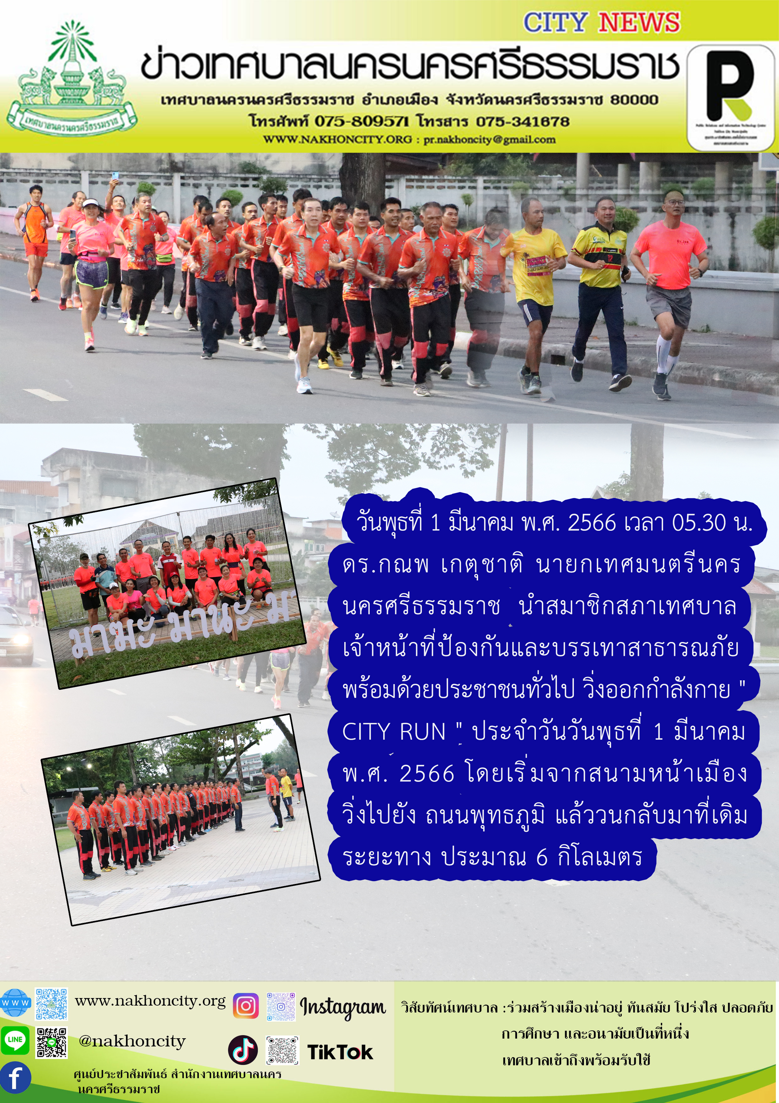 วันพุธที่ 1 มีนาคม พ.ศ. 2566 เวลา 05.30 น. ดร.กณพ เกตุชาติ นายกเทศมนตรีนครนครศรีธรรมราช นำสมาชิกสภาเทศบาล เจ้าหน้าที่ป้องกันและบรรเทาสาธารณภัย พร้อมด้วยประชาชนทั่วไป วิ่งออกกำลังกาย " CITY RUN " ประจำวันวันพุธที่ 1 มีนาคม พ.ศ. 2566โดยเริ่มจากสนามหน้าเมือง วิ่งไปยังถนนพุทธภูมิ แล้ววนกลับมาที่เดิม ระยะทางประมาณ 6 กิโลเมตร