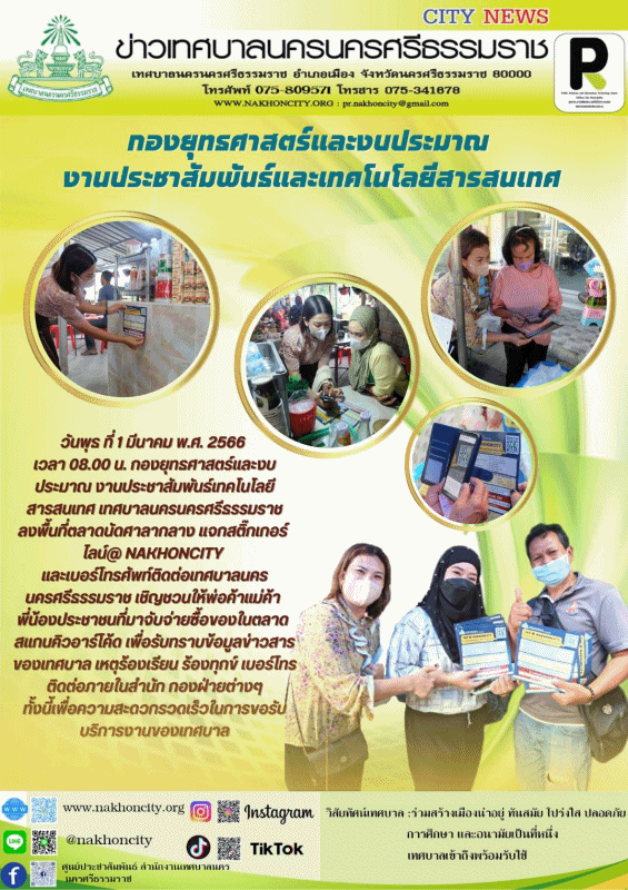 วันพุธ ที่ 1 มีนาคม พ.ศ. 2566 เวลา 08.00 น. กองยุทธศาสตร์และงบประมาณ งานประชาสัมพันธ์เทคโนโลยีสารสนเทศ เทศบาลนครนครศรีธรรมราช ลงพื้นที่ตลาดนัดศาลากลาง แจกสติ๊กเกอร์ ไลน์@ NAKHONCITY และเบอร์โทรศัพท์ติดต่อเทศบาลนครนครศรีธรรมราช เชิญชวนให้พ่อค้าแม่ค้า พี่น้องประชาชนที่มาจับจ่ายซื้อของในตลาด สแกนคิวอาร์โค้ด เพื่อรับทราบข้อมูลข่าวสารของเทศบาล เหตุร้องเรียน ร้องทุกข์ เบอร์โทรติดต่อภายในสำนัก กองฝ่ายต่างๆ |