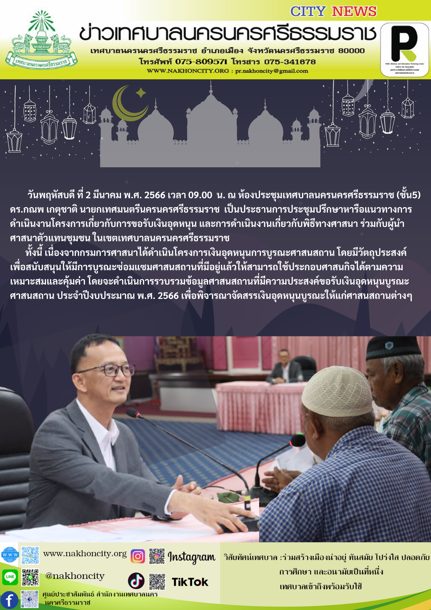 วันพฤหัสบดีที่ 2 มีนาคม พ.ศ. 2566 เวลา 09.00 น. ณ ห้องประชุมเทศบาลนครนครศรีธรรมราช (ชั้น5) ดร.กณพ เกตุชาติ นายกเทศมนตรีนครนครศรีธรรมราช เป็นประธานการประชุมปรึกษาหารือแนวทางการดำเนินงานโครงการเกี่ยวกับการขอรับเงินอุดหนุน และการดำเนินงานเกี่ยวกับพิธีทางศาสนา ร่วมกับผู้นำศาสนาตัวแทนชุมชน ในเขตเทศบาลนครนครศรีธรรมราช ทั้งนี้ เนื่องจากกรมการศาสนาได้ดำเนินโครงการเงินอุดหนุนการบูรณะศาสนสถาน โดยมีวัตถุประสงค์ เพื่อสนับสนุนให้มีการบูรณะซ่อมแซมศาสนสถานที่มีอยู่แล้วให้สามารถใช้ประกอบศาสนกิจได้ตามความเหมาะสมและคุ้มค่า โดยจะดำเนินการรวบรวมข้อมูลศาสนสถานที่มีความประสงค์ขอรับเงินอุดหนุนบูรณะศาสนสถาน ประจำปีงบประมาณ พ.ศ. 2566 เพื่อพิจารณาจัดสรรเงินอุดหนุนบูรณะให้แก่ศาสนสถานต่างๆ