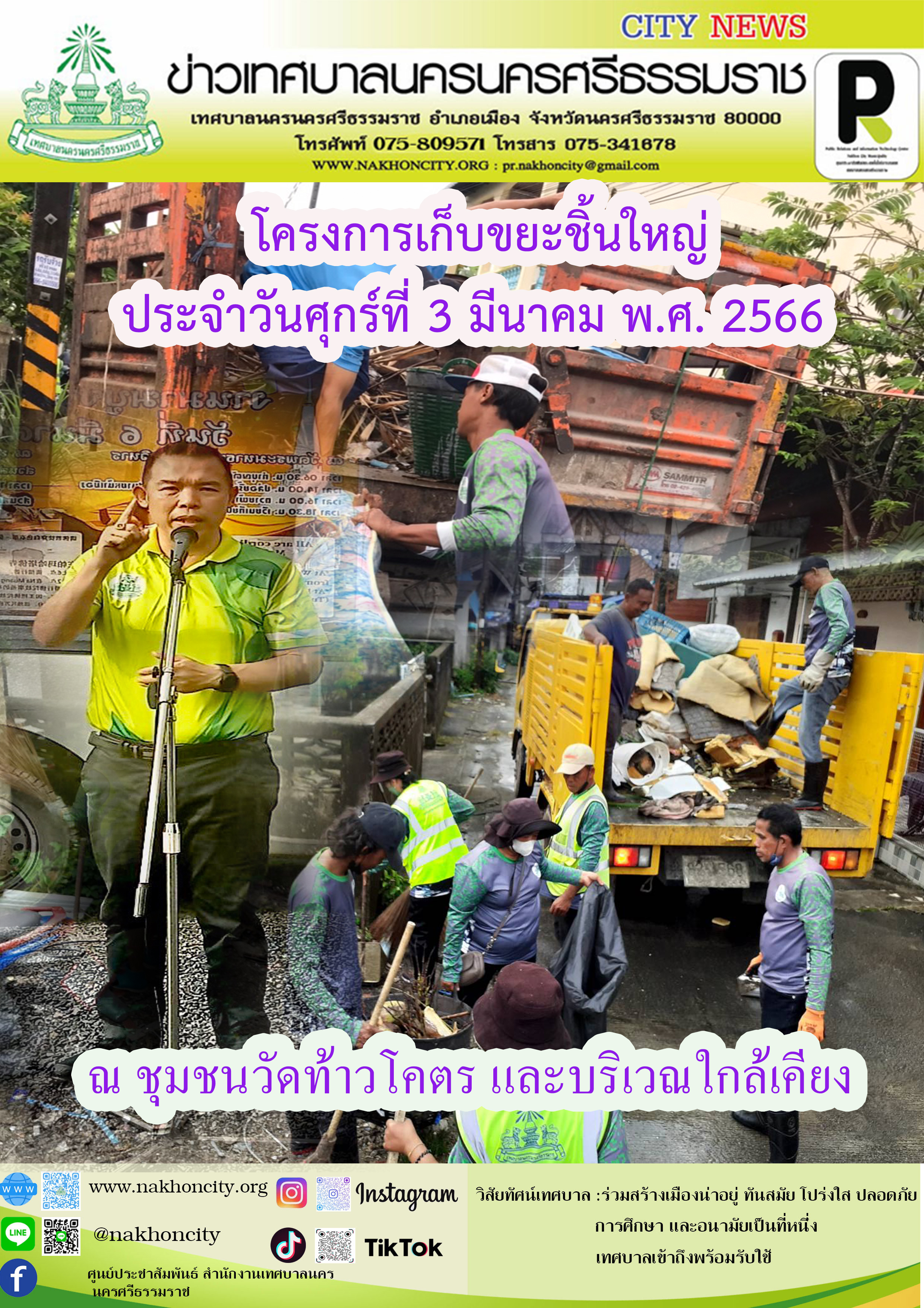 วันศุกร์ที่ 3 มีนาคม พ.ศ. 2566 เวลา 07.30 น. ดร.วงศ์วชิร โอวรารินท์ รองนายกเทศมนตรีนครนครศรีธรรมราช พร้อมเจ้าหน้าที่กองสาธารณสุขและสิ่งแวดล้อมเทศบาลนครนครศรีธรรมราช ลงพื้นที่พัฒนา เก็บขยะชิ้นใหญ่ สิ่งของชำรุดเศษวัสดุ อาทิ ที่นอนขนาดใหญ่ เตียง โต๊ะ เก้าอี้ พร้อมทั้ง เก็บกวาดขยะทั่วไป ตัดหญ้า และฉีดล้างถนน ณ ชุมชนวัดท้าวโคตร และบริเวณใกล้เคียง เพื่อความสะอาด สวยงาม และเป็นระเบียบเรียบร้อยของชุมชน