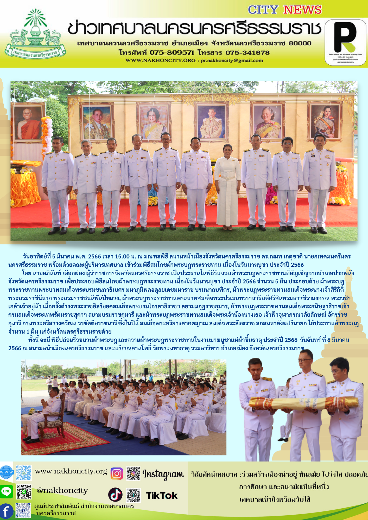 วันอาทิตย์ที่ 5 มีนาคม พ.ศ. 2566 เวลา 15.00 น. ณ มณฑลพิธี สนามหน้าเมืองจังหวัดนครศรีธรรมราช ดร.กณพ เกตุชาติ นายกเทศมนตรีนครนครศรีธรรมราช พร้อมด้วยคณะผู้บริหารเทศบาล เข้าร่วมพิธีสมโภชผ้าพระบฏพระราชทาน เนื่องในวันมาฆบูชา ประจำปี 2566 โดย นายอภินันท์ เผือกผ่อง ผู้ว่าราชการจังหวัดนครศรีธรรมราช เป็นประธานในพิธีรับมอบผ้าพระบฏพระราชทานที่อัญเชิญจากอำเภอปากพนัง จังหวัดนครศรีธรรมราช เพื่อประกอบพิธีสมโภชผ้าพระบฏพระราชทาน เนื่องในวันมาฆบูชา ประจำปี 2566 จำนวน 5 ผืน ประกอบด้วย ผ้าพระบฏพระราชทานพระบาทสมเด็จพระบรมชนกาธิเบศร มหาภูมิพลอดุลยเดชมหาราช บรมนาถบพิตร, ผ้าพระบฏพระราชทานสมเด็จพระนางเจ้าสิริกิติ์ พระบรมราชินีนาถ พระบรมราชชนนีพันปีหลวง, ผ้าพระบฏพระราชทานพระบาทสมเด็จพระปรเมนทรรามาธิบดีศรีสินทรมหาวชิราลงกรณ พระวชิรเกล้าเจ้าอยู่หัว เมื่อครั้งดำรงพระราชอิสริยยศสมเด็จพระบรมโอรสาธิราชฯ สยามมกุฎราชกุมาร, ผ้าพระบฏพระราชทานสมเด็จพระกนิษฐาธิราชเจ้า กรมสมเด็จพระเทพรัตนราชสุดาฯ สยามบรมราชกุมารี และผ้าพระบฏพระราชทานสมเด็จพระเจ้าน้องนางเธอ เจ้าฟ้าจุฬาภรณวลัยลักษณ์ อัครราชกุมารี กรมพระศรีสวางควัฒน วรขัตติยราชนารี ซึ่งในปีนี้ สมเด็จพระอริยวงศาคตญาณ สมเด็จพระสังฆราช สกลมหาสังฆปรินายก ได้ประทานผ้าพระบฎ จำนวน 1 ผืน แก่จังหวัดนครศรีธรรมราชด้วย ทั้งนี้ จะมี พิธีปล่อยริ้วขบวนผ้าพระบฎและถวายผ้าพระบฎพระราชทานในงานมาฆบูชาแห่ผ้าขึ้นธาตุ ประจำปี 2566 วันจันทร์ ที่ 6 มีนาคม 2566 ณ สนามหน้าเมืองนครศรีธรรมราช และบริเวณลานโพธิ์ วัดพระมหาธาตุ วรมหาวิหาร อำเภอเมือง จังหวัดนครศรีธรรมราช |