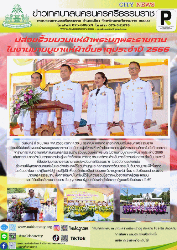 วันจันทร์ ที่ 6 มีนาคม พ.ศ.2566 เวลา 14.30 น. ดร.กณพ เกตุชาติ นายกเทศมนตรีนครนครศรีธรรมราช ร่วมพิธีปล่อยริ้วขบวนผ้าพระบฏพระราชทาน โดยมีคณะผู้บริหาร หัวหน้าส่วนราชการ ผู้บริหารสถานศึกษาในสังกัดเทศบาล ข้าราชการ พนักงานเทศบาลนครนครศรีธรรมราช ร่วมขบวนแห่ผ้าพระบฎ ในงานมาฆบูชาแห่ผ้าขึ้นธาตุประจำปี 2566 เส้นทางถนนราชดำเนิน จากศาลาประดู่หก ถึงวัดพระมหาธาตุ วรมหาวิหาร สำหรับการจัดงานดังกล่าว ถือเป็นประเพณีที่สืบต่อกันมาอย่างยาวนาน ของจังหวัดนครศรีธรรมราช โดยมีวัตถุประสงค์เพื่อส่งเสริมให้พุทธศาสนิกชนทั้งในและต่างประเทศได้ร่วมทำบุญและกิจกรรมทางวัฒนธรรมในวันมาฆบูชาแห่ผ้าขึ้นธาตุ โดยน้อมนำโอวาทปาฏิโมกข์ไปสู่การปฏิบัติ เพื่ออนุรักษ์และสืบสานประเพณีมาฆบูชาแห่ผ้าขึ้นธาตุอันเป็นเอกลักษณ์ของชาวนครศรีธรรมราช ซึ่งการจัดงานในครั้งนี้ได้รับความร่วมมือจากหน่วยงานภาครัฐและเอกชน และได้รับเกียรติจากนายธนกร วังบุญคงชนะ รัฐมนตรีประจำสำนักนายกรัฐมนตรี เป็นประธานในพิธี …………… ภาพ//ข่าว//จันทร์จิรา ตรวจทาน//ฐิตินันท์ |