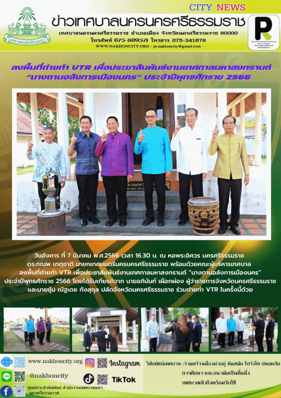 วันอังคาร ที่ 7 มีนาคม พ.ศ.2566 เวลา 16.30 น. ณ หอพระอิศวร นครศรีธรรมราช ดร.กณพ เกตุชาติ นายกเทศมนตรีนครนครศรีธรรมราช พร้อมด้วยคณะผู้บริหารเทศบาล ลงพื้นที่ถ่ายทำ VTR เพื่อประชาสัมพันธ์งานเทศกาลมหาสงกรานต์ “นางดานอลังการเมืองนคร” ประจำปีพุทธศักราช 2566 โดยได้รับเกียรติจาก นายอภินันท์ เผือกผ่อง ผู้ว่าราชการจังหวัดนครศรีธรรมราช และนายชุ้น ณัฐเดช กังสุกุล ปลัดจังหวัดนครศรีธรรมราช ร่วมถ่ายทำ VTR ในครั้งนี้ด้วย ............... ภาพ//ข่าว//จันทร์จิรา ตรวจทาน//ฐิตินันท์ |