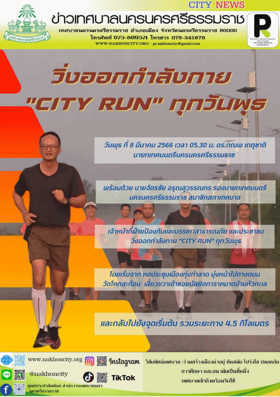 ดร.กณพ เกตุชาติ นายกเทศมนตรีนครนครศรีธรรมราช พร้อมด้วยคณะผู้บริหาร สมาชิกสภาเทศบาล เจ้าหน้าที่ฝ่ายป้องกันและบรรเทาสาธารณภัย ประชาชนทั่วไป วิ่งออกกำลังกาย "CITY RUN" ทุกวันพุธ |