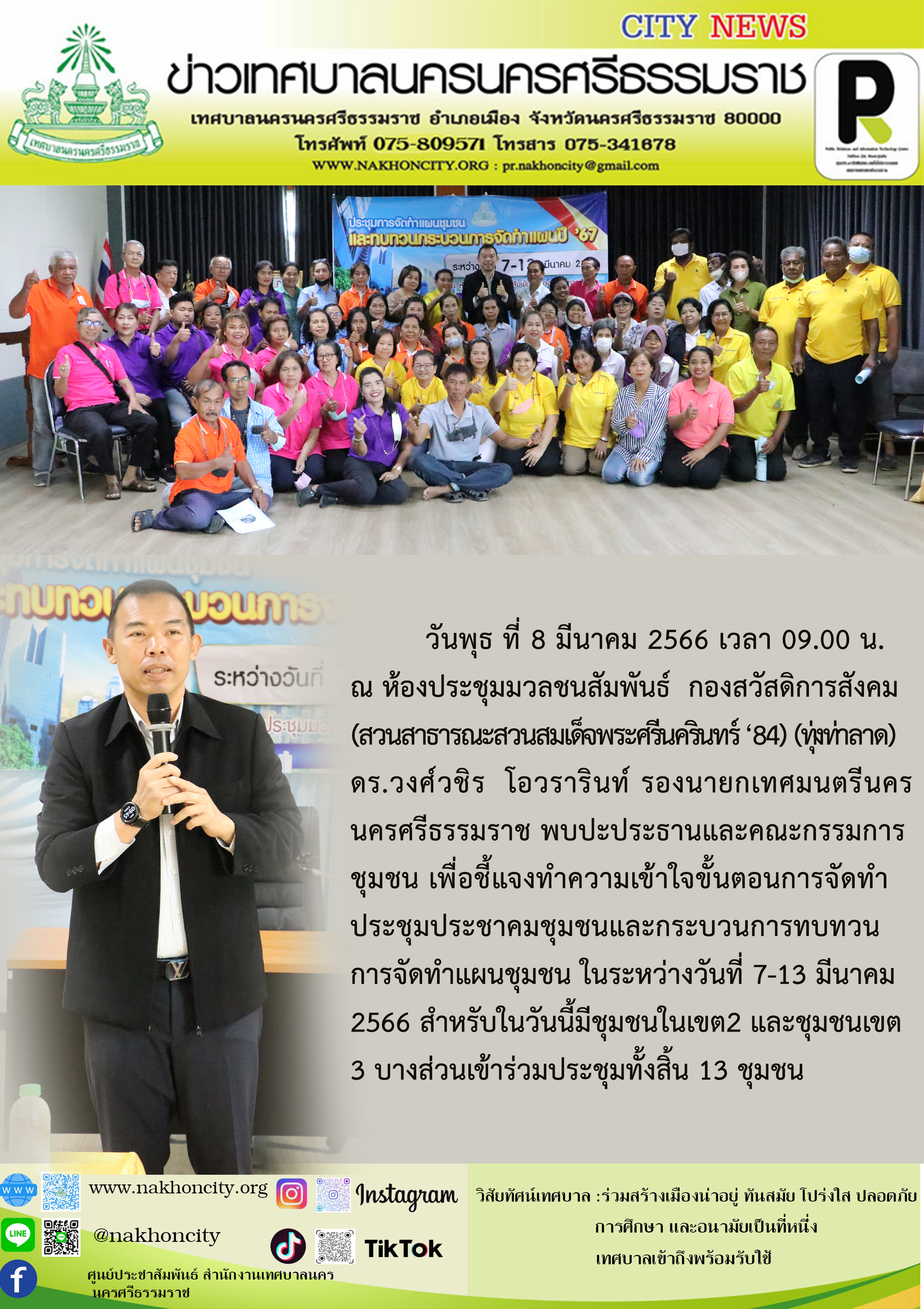 วันพุธ ที่ 8 มีนาคม 2566 เวลา 09.00 น. ณ ห้องประชุมมวลชนสัมพันธ์ กองสวัสดิการสังคม (สวนสาธารณะสวนสมเด็จพระศรีนครินทร์ ‘84) (ทุ่งท่าลาด) ดร.วงศ์วชิร โอวรารินท์ รองนายกเทศมนตรีนครนครศรีธรรมราช พบปะประธานและคณะกรรมการชุมชน เพื่อชี้แจงทำความเข้าใจขั้นตอนการจัดทำประชุมประชาคมชุมชน และกระบวนการทบทวนการจัดทำแผนชุมชน ในระหว่างวันที่ 7-13 มีนาคม 2566 สำหรับในวันนี้มีชุมชนในเขต2 และชุมชนเขต3 บางส่วนเข้าร่วมประชุมทั้งสิ้น 13 ชุมชน