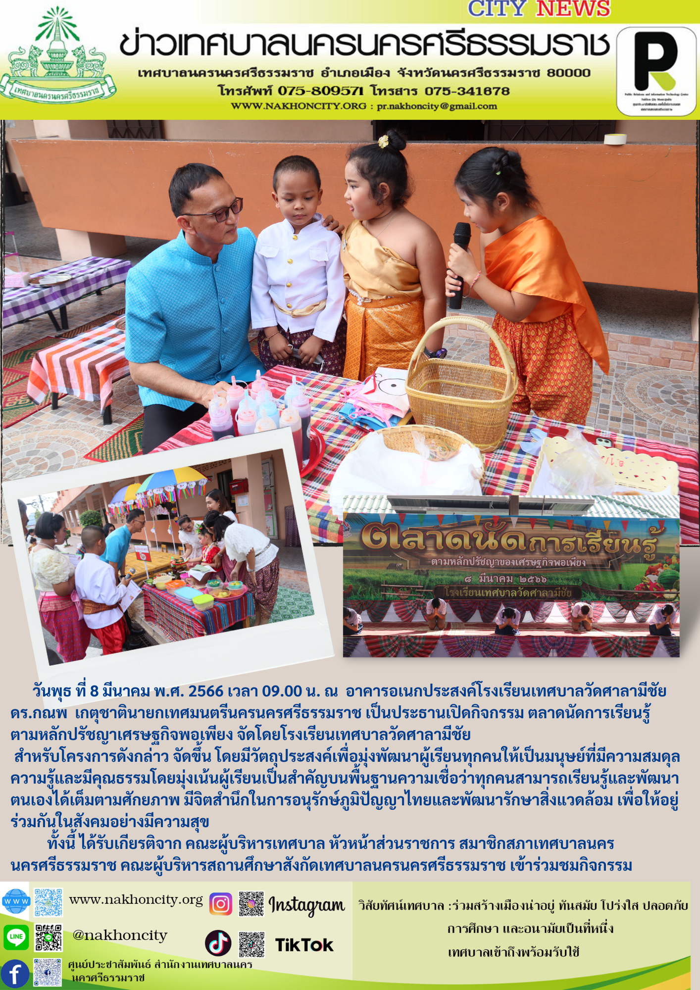วันพุธ ที่ 8 มีนาคม พ.ศ. 2566 เวลา 09.00 น. ณ อาคารอเนกประสงค์โรงเรียนเทศบาลวัดศาลามีชัย ดร.กณพ เกตุชาติ นายกเทศมนตรีนครนครศรีธรรมราช เป็นประธานเปิดกิจกรรม ตลาดนัดการเรียนรู้ ตามหลักปรัชญาเศรษฐกิจพอเพียง จัดโดยโรงเรียนเทศบาลวัดศาลามีชัย สำหรับโครงการดังกล่าว จัดขึ้น โดยมีวัตถุประสงค์เพื่อมุ่งพัฒนาผู้เรียนทุกคนให้เป็นมนุษย์ที่มีความสมดุล ความรู้และมีคุณธรรมโดยมุ่งเน้นผู้เรียนเป็นสำคัญบนพื้นฐานความเชื่อว่าทุกคนสามารถเรียนรู้และพัฒนาตนเองได้เต็มตามศักยภาพ มีจิตสำนึกในการอนุรักษ์ภูมิปัญญาไทยและพัฒนารักษาสิ่งแวดล้อม เพื่อให้อยู่ร่วมกันในสังคมอย่างมีความสุข ทั้งนี้ ได้รับเกียรติจาก คณะผู้บริหารเทศบาล หัวหน้าส่วนราชการ สมาชิกสภาเทศบาลนครนครศรีธรรมราช คณะผู้บริหารสถานศึกษาสังกัดเทศบาลนครนครศรีธรรมราช เข้าร่วมชมกิจกรรม |