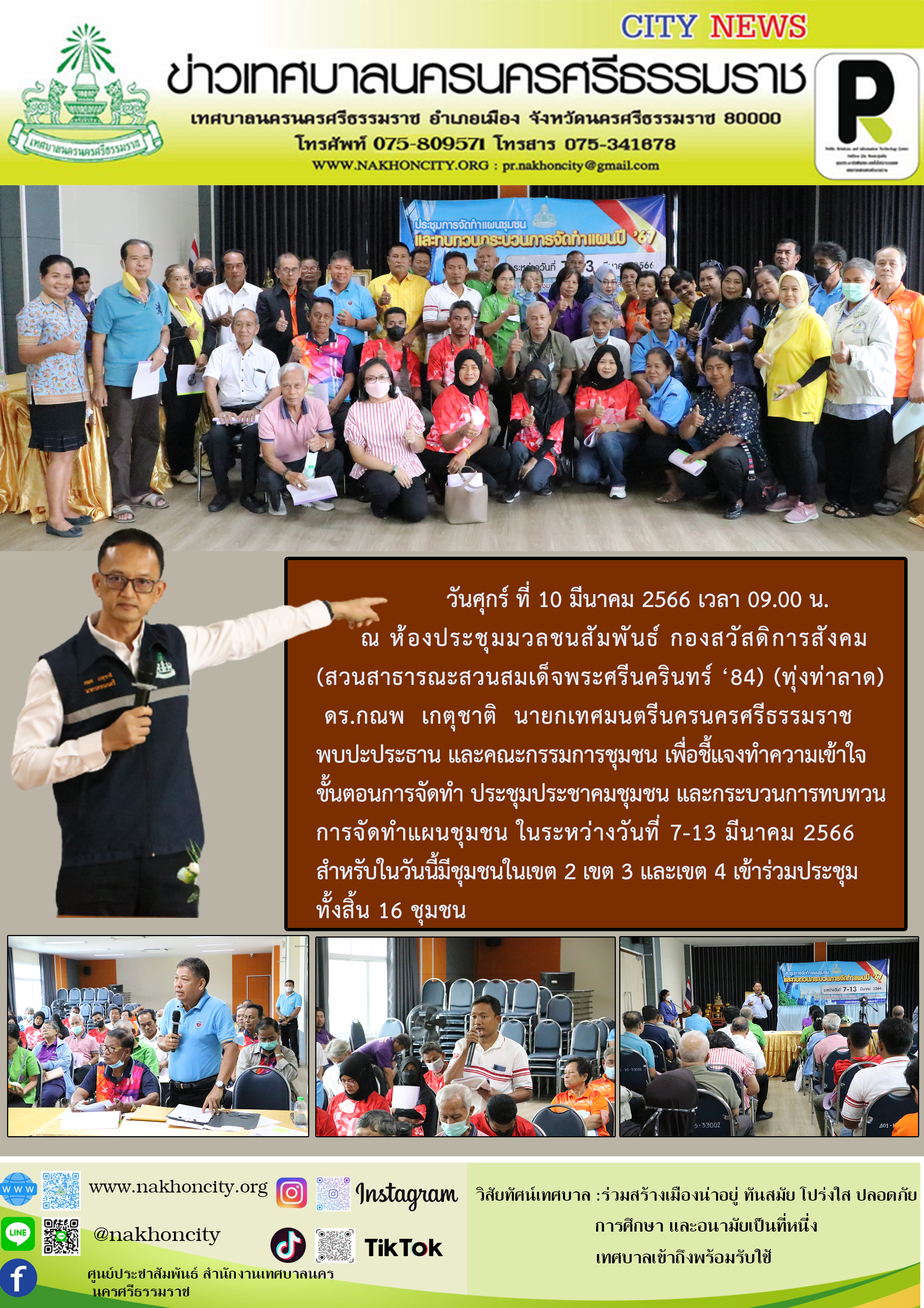 วันศุกร์ ที่ 10 มีนาคม 2566 เวลา 09.00 น. ณ ห้องประชุมมวลชนสัมพันธ์ กองสวัสดิการสังคม (สวนสาธารณะสวนสมเด็จพระศรีนครินทร์ ‘84) (ทุ่งท่าลาด) ดร.กณพ เกตุชาติ นายกเทศมนตรีนครนครศรีธรรมราช พบปะประธานและคณะกรรมการชุมชน เพื่อชี้แจงทำความเข้าใจขั้นตอนการจัดทำประชุมประชาคมชุมชน และกระบวนการทบทวนการจัดทำแผนชุมชน ในระหว่างวันที่ 7-13 มีนาคม 2566 สำหรับในวันนี้มีชุมชนในเขต 2 เขต 3 และเขต 4 เข้าร่วมประชุมทั้งสิ้น 16 ชุมชน