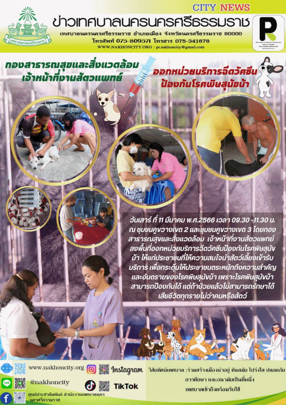 วันเสาร์ ที่ 11 มีนาคม พ.ศ.2566 เวลา 09.30 -11.30 น. ณ ชุมชนคูขวางเขต 2 และชุมชนคูขวางเขต 3 โดยกองสาธารณสุขและสิ่งแวดล้อม เจ้าหน้าที่งานสัตวแพทย์ ลงพื้นที่ออกหน่วยบริการฉีดวัคซีนป้องกันโรคพิษสุนัขบ้า ให้แก่ประชาชนที่ให้ความสนใจนำสัตว์เลี้ยงเข้ารับบริการ เพื่อกระตุ้นให้ประชาชนตระหนักถึงความสำคัญและอันตรายของโรคพิษสุนัขบ้า เพราะโรคพิษสุนัขบ้าสามารถป้องกันได้ แต่ถ้าป่วยแล้วไม่สามารถรักษาได้ เสียชีวิตทุกรายไม่ว่าคนหรือสัตว์ ซึ่งในวันนี้มีประชาชนทยอยนำสัตว์เลี้ยง สุนัขและแมว มาลงทะเบียนแจ้งชื่อ อายุของสัตว์เลี้ยงรับบริการฉีดวัคซีนป้องกันโรคพิษสุนัขบ้า รับใบรับรองและป้ายโลหะไปคล้องคอสัตว์เลี้ยง สามารถติดต่อสอบถามได้ที่สถานพยาบาลสัตว์ทุ่งท่าลาด โทร.075 358292 ( วัน-เวลาราชการ ) ................... ภาพ//ข่าว//จันทร์จิรา |