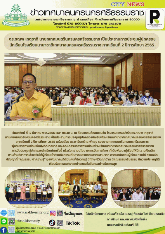 ดร.กณพ เกตุชาติ นายกเทศมนตรีนครนครศรีธรรมราช เป็นประธานการประชุมผู้ปกครองนักเรียนโรงเรียนนานาชาติเทศบาลนครนครศรีธรรมราช ภาคเรียนที่ 2 ปีการศึกษา 2565 |