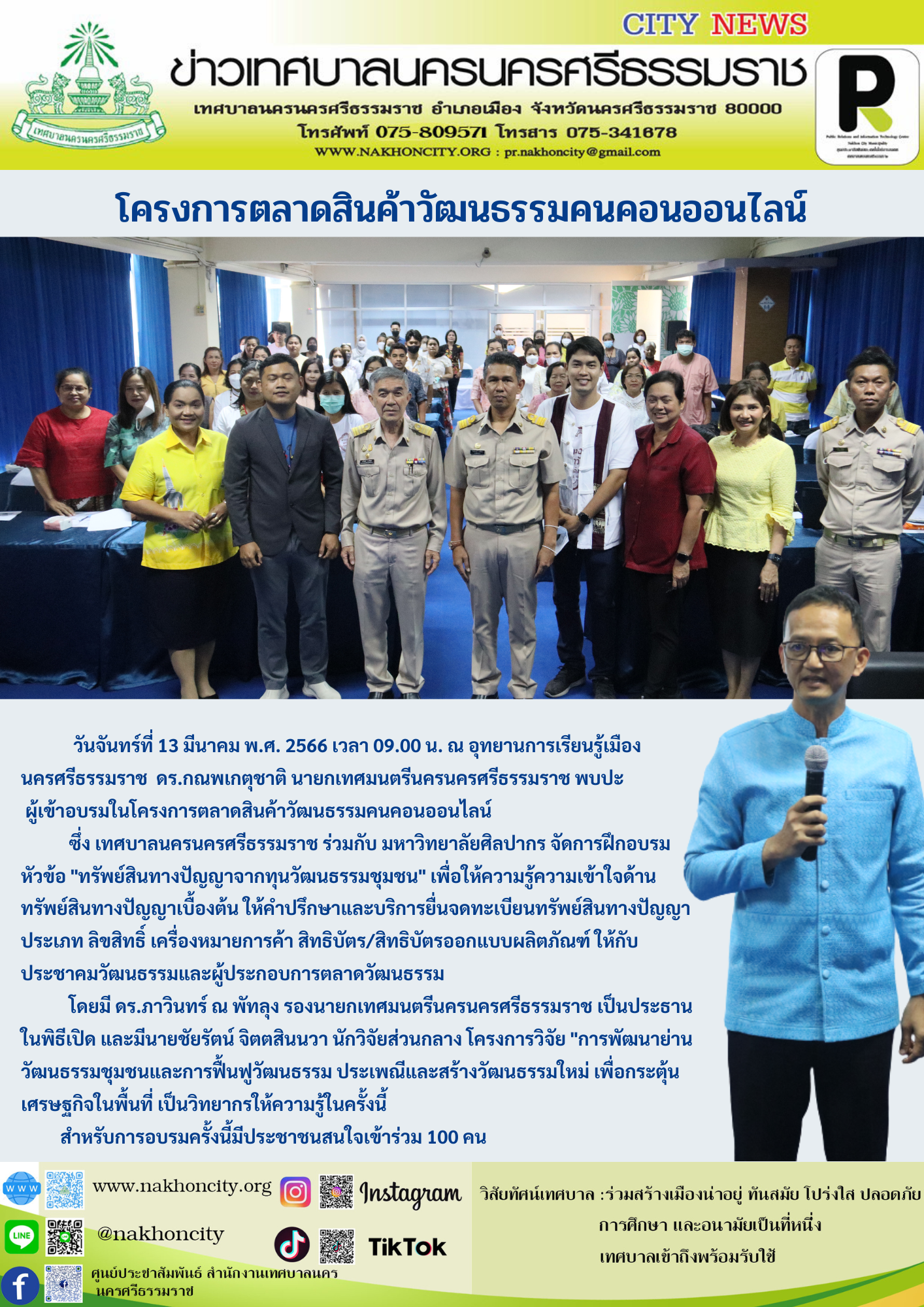 วันจันทร์ที่ 13 มีนาคม พ.ศ. 2566 เวลา 09.00 น. ณ อุทยานการเรียนรู้เมืองนครศรีธรรมราช ดร.กณพ เกตุชาติ นายกเทศมนตรีนครนครศรีธรรมราช พบปะ ผู้เข้าอบรมในโครงการตลาดสินค้าวัฒนธรรมคนคอนออนไลน์ ซึ่ง เทศบาลนครนครศรีธรรมราช ร่วมกับ มหาวิทยาลัยศิลปากร จัดการฝึกอบรม หัวข้อ "ทรัพย์สินทางปัญญาจากทุนวัฒนธรรมชุมชน" เพื่อให้ความรู้ความเข้าใจด้านทรัพย์สินทางปัญญาเบื้องต้น ให้คำปรึกษาและบริการยื่นจดทะเบียนทรัพย์สินทางปัญญา ประเภท ลิขสิทธิ์ เครื่องหมายการค้า สิทธิบัตร/สิทธิบัตรออกแบบผลิตภัณฑ์ ให้กับประชาคมวัฒนธรรมและผู้ประกอบการตลาดวัฒนธรรม โดยมี ดร.ภาวินทร์ ณ พัทลุง รองนายกเทศมนตรีนครนครศรีธรรมราช เป็นประธานในพิธีเปิด และมีนายชัยรัตน์ จิตตสินนวา นักวิจัยส่วนกลาง โครงการวิจัย "การพัฒนาย่านวัฒนธรรมชุมชนและการฟื้นฟูวัฒนธรรม ประเพณีและสร้างวัฒนธรรมใหม่ เพื่อกระตุ้นเศรษฐกิจในพื้นที่ เป็นวิทยากรให้ความรู้ในครั้งนี้ สำหรับการอบรมครั้งนี้มีประชาชนสนใจเข้าร่วม 100 คน |