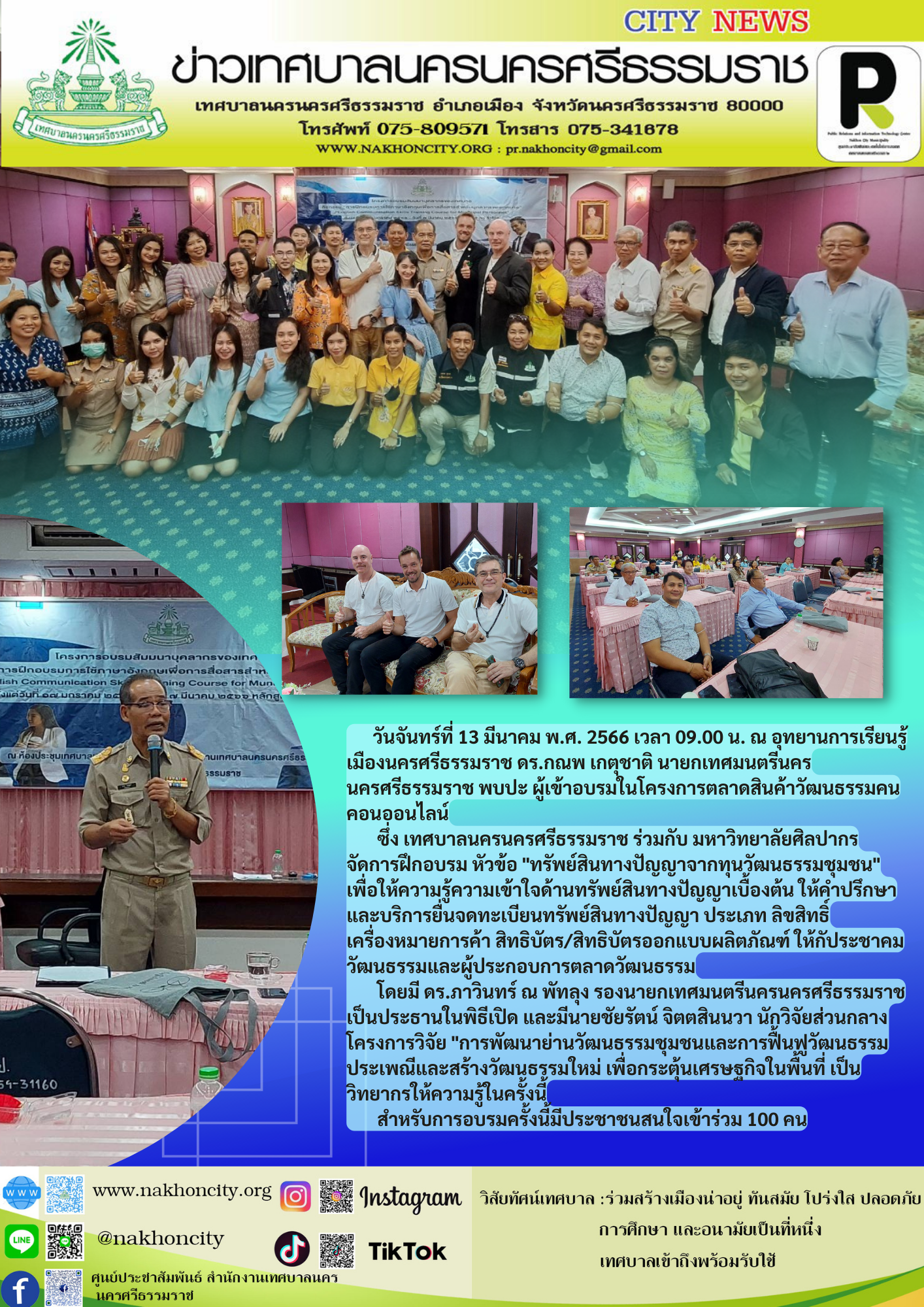 วันจันทร์ที่ 13 มีนาคม พ.ศ. 2566 เวลา 09.00 น. ณ อุทยานการเรียนรู้เมืองนครศรีธรรมราช ดร.กณพ เกตุชาติ นายกเทศมนตรีนครนครศรีธรรมราช พบปะ ผู้เข้าอบรมในโครงการตลาดสินค้าวัฒนธรรมคนคอนออนไลน์ ซึ่ง เทศบาลนครนครศรีธรรมราช ร่วมกับ มหาวิทยาลัยศิลปากร จัดการฝึกอบรม หัวข้อ "ทรัพย์สินทางปัญญาจากทุนวัฒนธรรมชุมชน" เพื่อให้ความรู้ความเข้าใจด้านทรัพย์สินทางปัญญาเบื้องต้น ให้คำปรึกษาและบริการยื่นจดทะเบียนทรัพย์สินทางปัญญา ประเภท ลิขสิทธิ์ เครื่องหมายการค้า สิทธิบัตร/สิทธิบัตรออกแบบผลิตภัณฑ์ ให้กับประชาคมวัฒนธรรมและผู้ประกอบการตลาดวัฒนธรรม โดยมี ดร.ภาวินทร์ ณ พัทลุง รองนายกเทศมนตรีนครนครศรีธรรมราช เป็นประธานในพิธีเปิด และมีนายชัยรัตน์ จิตตสินนวา นักวิจัยส่วนกลาง โครงการวิจัย "การพัฒนาย่านวัฒนธรรมชุมชนและการฟื้นฟูวัฒนธรรม ประเพณีและสร้างวัฒนธรรมใหม่ เพื่อกระตุ้นเศรษฐกิจในพื้นที่ เป็นวิทยากรให้ความรู้ในครั้งนี้ สำหรับการอบรมครั้งนี้มีประชาชนสนใจเข้าร่วม 100 คน |