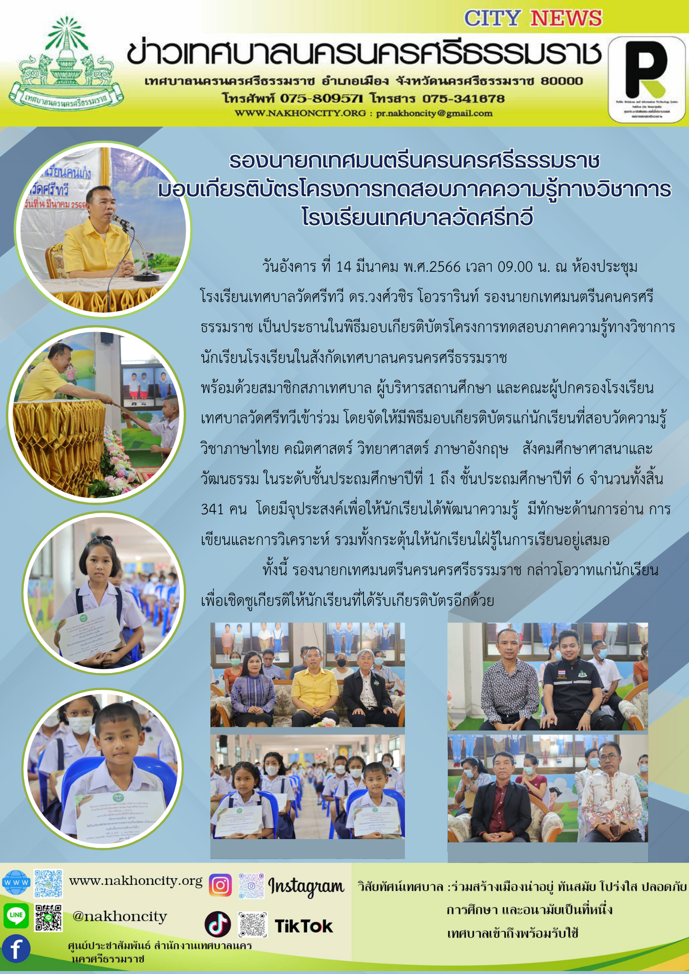 วันอังคาร ที่ 14 มีนาคม พ.ศ.2566 เวลา 09.00 น. ณ ห้องประชุม โรงเรียนเทศบาลวัดศรีทวี ดร.วงศ์วชิร โอวรารินท์ รองนายกเทศมนตรีนครนครศรีธรรมราช เป็นประธานในพิธีมอบเกียรติบัตรโครงการทดสอบภาคความรู้ทางวิชาการนักเรียน โรงเรียนในสังกัดเทศบาลนครนครศรีธรรมราช พร้อมด้วยสมาชิกสภาเทศบาล ผู้บริหารสถานศึกษา และคณะผู้ปกครองโรงเรียนเทศบาลวัดศรีทวีเข้าร่วม โดยจัดให้มีพิธีมอบเกียรติบัตรแก่นักเรียนที่สอบวัดความรู้วิชาภาษาไทย คณิตศาสตร์ วิทยาศาสตร์ ภาษาอังกฤษ สังคมศึกษาศาสนาและวัฒนธรรม ในระดับชั้นประถมศึกษาปีที่ 1 ถึง ชั้นประถมศึกษาปีที่ 6 จำนวนทั้งสิ้น 341 คน โดยมีจุประสงค์เพื่อให้นักเรียนได้พัฒนาความรู้ มีทักษะในการอ่าน การเขียนและการวิเคราะห์ รวมทั้งกระตุ้นให้นักเรียนใฝ่รู้ในการเรียนอยู่เสมอ ทั้งนี้ รองนายกเทศมนตรีนครนครศรีธรรมราช กล่าวโอวาทแก่นักเรียน เพื่อเชิดชูเกียรติให้นักเรียนที่ได้รับเกียรติบัตรอีกด้วย