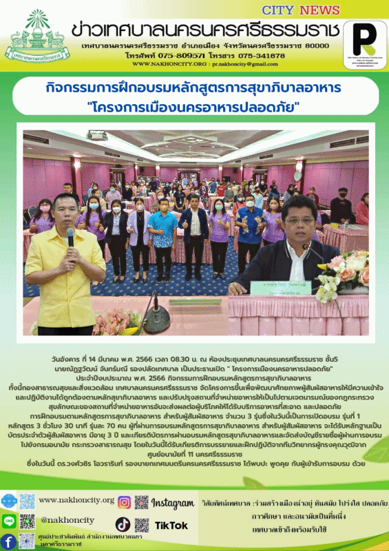 กองสาธารณสุขและสิ่งแวดล้อม เทศบาลนครนครศรีธรรมราช จัดกิจกรรมการฝึกอบรมหลักสูตรการสุขาภิบาลอาหาร "โครงการเมืองนครอาหารปลอดภัย" |