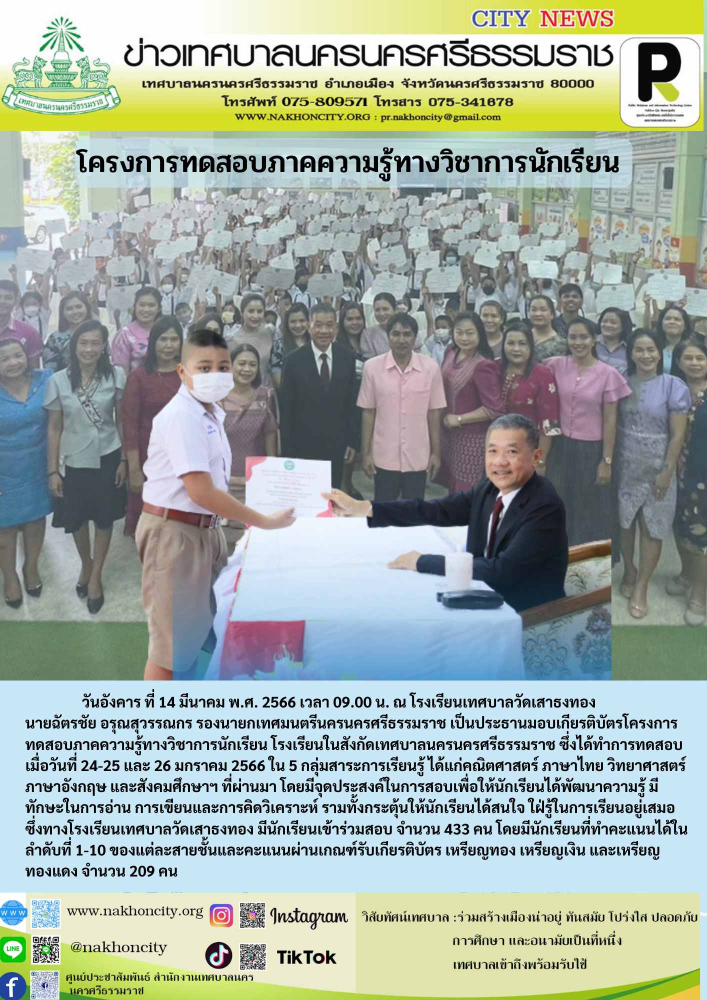 วันอังคาร ที่ 14 มีนาคม พ.ศ. 2566 เวลา 09.00 น. ณ โรงเรียนเทศบาลวัดเสาธงทอง นายฉัตรชัย อรุณสุวรรณกร รองนายกเทศมนตรีนครนครศรีธรรมราช เป็นประธานมอบเกียรติบัตรโครงการทดสอบภาคความรู้ทางวิชาการนักเรียน โรงเรียนเทศบาลวัดเสาธงทอง ซึ่งได้ทำการทดสอบเมื่อวันที่ 24-25 และ 26 มกราคม 2566 ใน 5 กลุ่มสาระการเรียนรู้ ได้แก่คณิตศาสตร์ ภาษาไทย วิทยาศาสตร์ ภาษาอังกฤษ และสังคมศึกษาฯ ที่ผ่านมา โดยมีจุดประสงค์ในการสอบเพื่อให้นักเรียนได้พัฒนาความรู้ มีทักษะในการอ่าน การเขียนและการคิดวิเคราะห์ รามทั้งกระตุ้นให้นักเรียนได้สนใจ ใฝ่รู้ในการเรียนอยู่เสมอ ซึ่งทางโรงเรียนเทศบาลวัดเสาธงทอง มีนักเรียนเข้าร่วมสอบ จำนวน 433 คน โดยมีนักเรียนที่ทำคะแนนได้ในลำดับที่ 1-10 ของแต่ละสายชั้นและคะแนนผ่านเกณฑ์รับเกียรติบัตร เหรียญทอง เหรียญเงิน และเหรียญทองแดง จำนวน 209 คน |