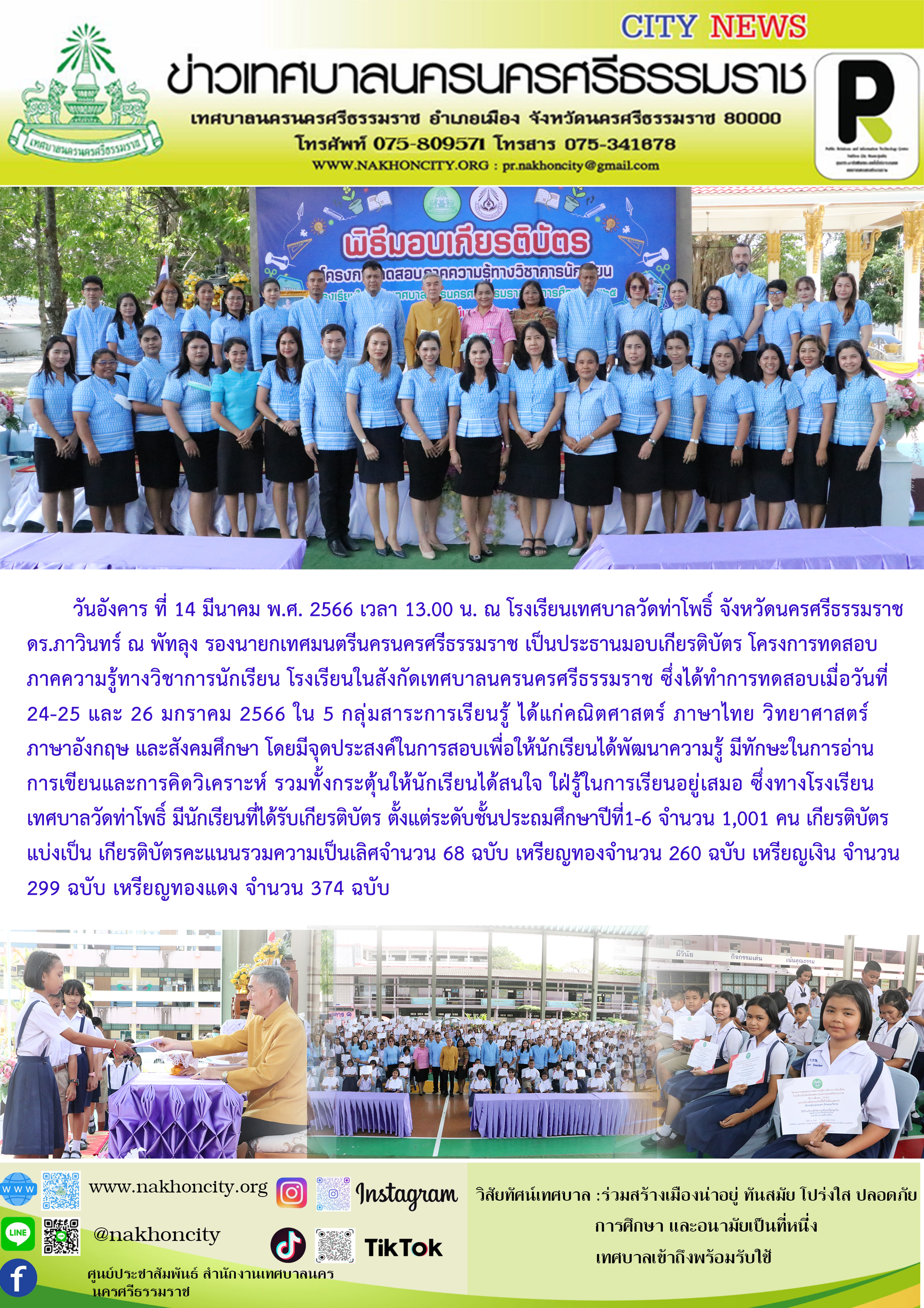 วันอังคาร ที่ 14 มีนาคม พ.ศ. 2566 เวลา 13.00 น. ณ โรงเรียนเทศบาลวัดท่าโพธิ์ ดร.ภาวินทร์ ณ พัทลุง รองนายกเทศมนตรีนครนครศรีธรรมราช เป็นประธานมอบเกียรติบัตรโครงการทดสอบภาคความรู้ทางวิชาการนักเรียน โรงเรียนในสังกัดเทศบาลนครนครศรีธรรมราช ซึ่งได้ทำการทดสอบเมื่อวันที่ 24-25 และ 26 มกราคม 2566 ใน 5 กลุ่มสาระการเรียนรู้ ได้แก่คณิตศาสตร์ ภาษาไทย วิทยาศาสตร์ ภาษาอังกฤษ และสังคมศึกษา โดยมีจุดประสงค์ในการสอบเพื่อให้นักเรียนได้พัฒนาความรู้ มีทักษะในการอ่าน การเขียนและการคิดวิเคราะห์ รวมทั้งกระตุ้นให้นักเรียนได้สนใจ ใฝ่รู้ในการเรียนอยู่เสมอ ซึ่งทางโรงเรียนเทศบาลวัดท่าโพธิ์ มีนักเรียนที่ได้รับเกียรติบัตร ตั้งแต่ระดับชั้นประถมศึกษาปีที่1-6 จำนวน 1,001 คน เกียรติบัตร แบ่งเป็น เกียรติบัตรคะแนนรวมความเป็นเลิศจำนวน 68 ฉบับ เหรียญทองจำนวน 260 ฉบับ เหรียญเงิน จำนวน 299 ฉบับ เหรียญทองแดง จำนวน 374 ฉบับ ภาพ//ข่าว/ไกรสิทธิ |