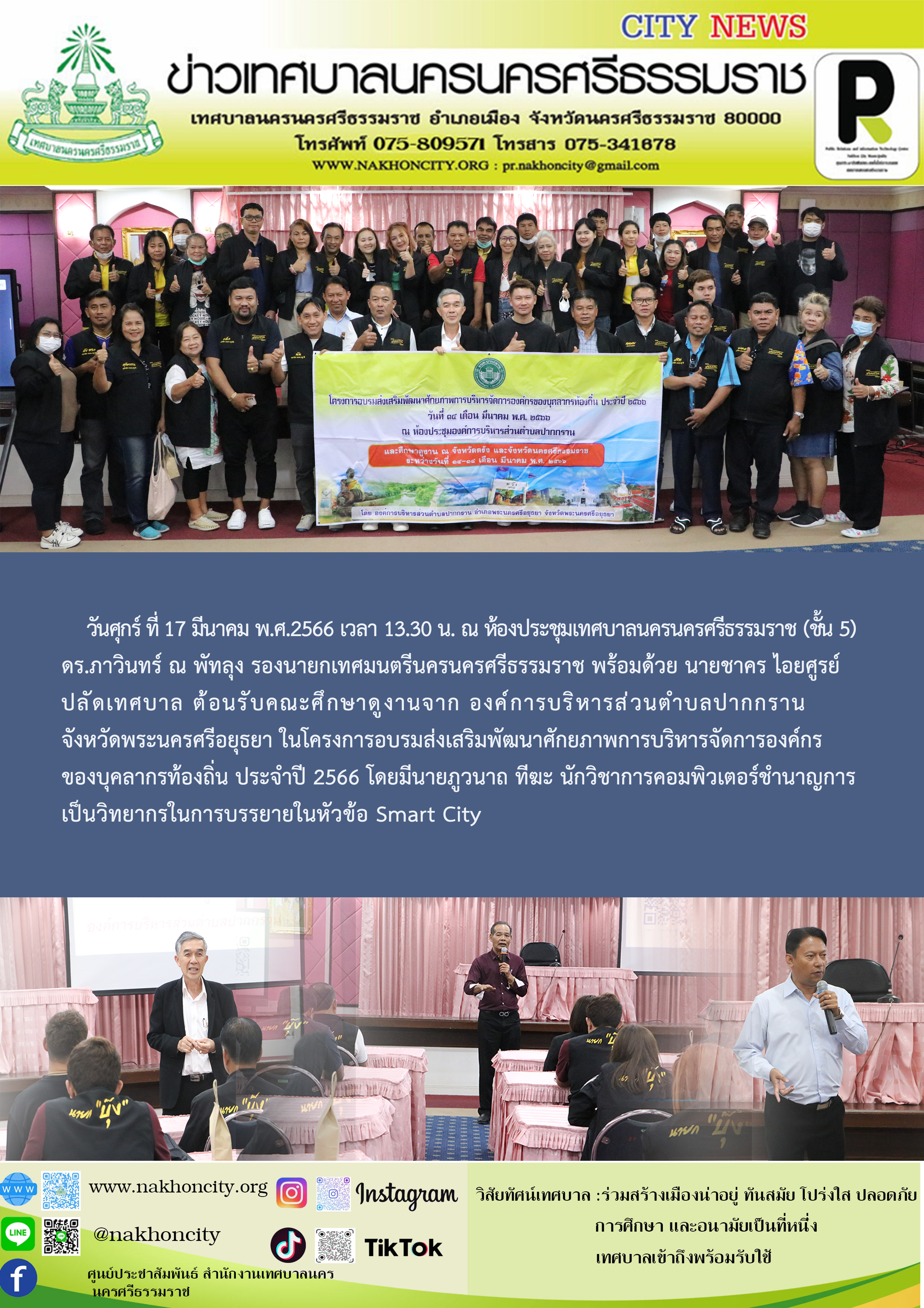 ดร.ภาวินทร์ ณ พัทลุง รองนายกเทศมนตรีนครนครศรีธรรมราช พร้อมด้วย นายชาคร ไอยศูรย์ ปลัดเทศบาล ต้อนรับคณะศึกษาดูงานจาก องค์การบริหารส่วนตำบลปากกราน จังหวัดพระนครศรีอยุธยา ในโครงการอบรมส่งเสริมพัฒนาศักยภาพการบริหารจัดการองค์กรของบุคลากรท้องถิ่น ประจำปี 2566 |