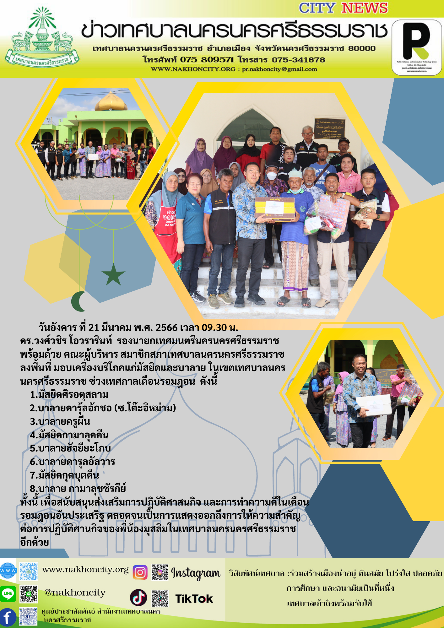 วันอังคาร ที่ 21 มีนาคม พ.ศ. 2566 เวลา 09.30 น. ดร.วงศ์วชิร โอวรารินท์ รองนายกเทศมนตรีนครนครศรีธรรมราช พร้อมด้วย คณะผู้บริหาร สมาชิกสภาเทศบาลนครนครศรีธรรมราช ลงพื้นที่ มอบเครื่องบริโภคแก่มัสยิดและบาลาย ในเขตเทศบาลนครนครศรีธรรมราช ช่วงเทศกาลเดือนรอมฎอน ดังนี้
