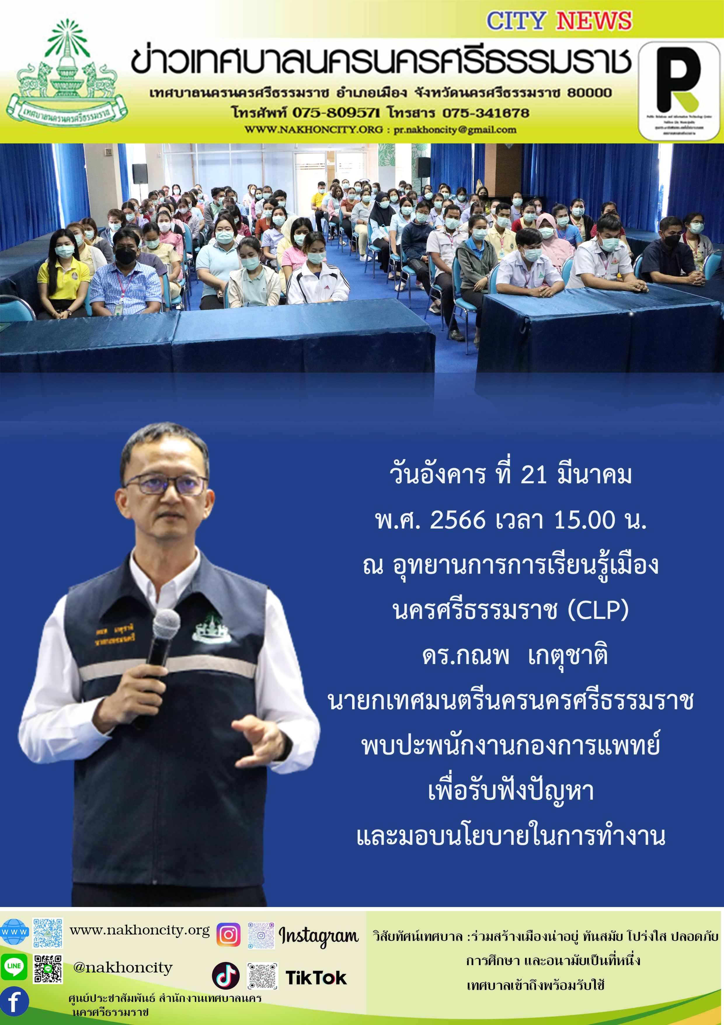 ดร.กณพ เกตุชาติ นายกเทศมนตรีนครนครศรีธรรมราช พบปะพนักงานกองการแพทย์ เพื่อรับฟังปัญหา และมอบนโยบายในการทำงาน |
