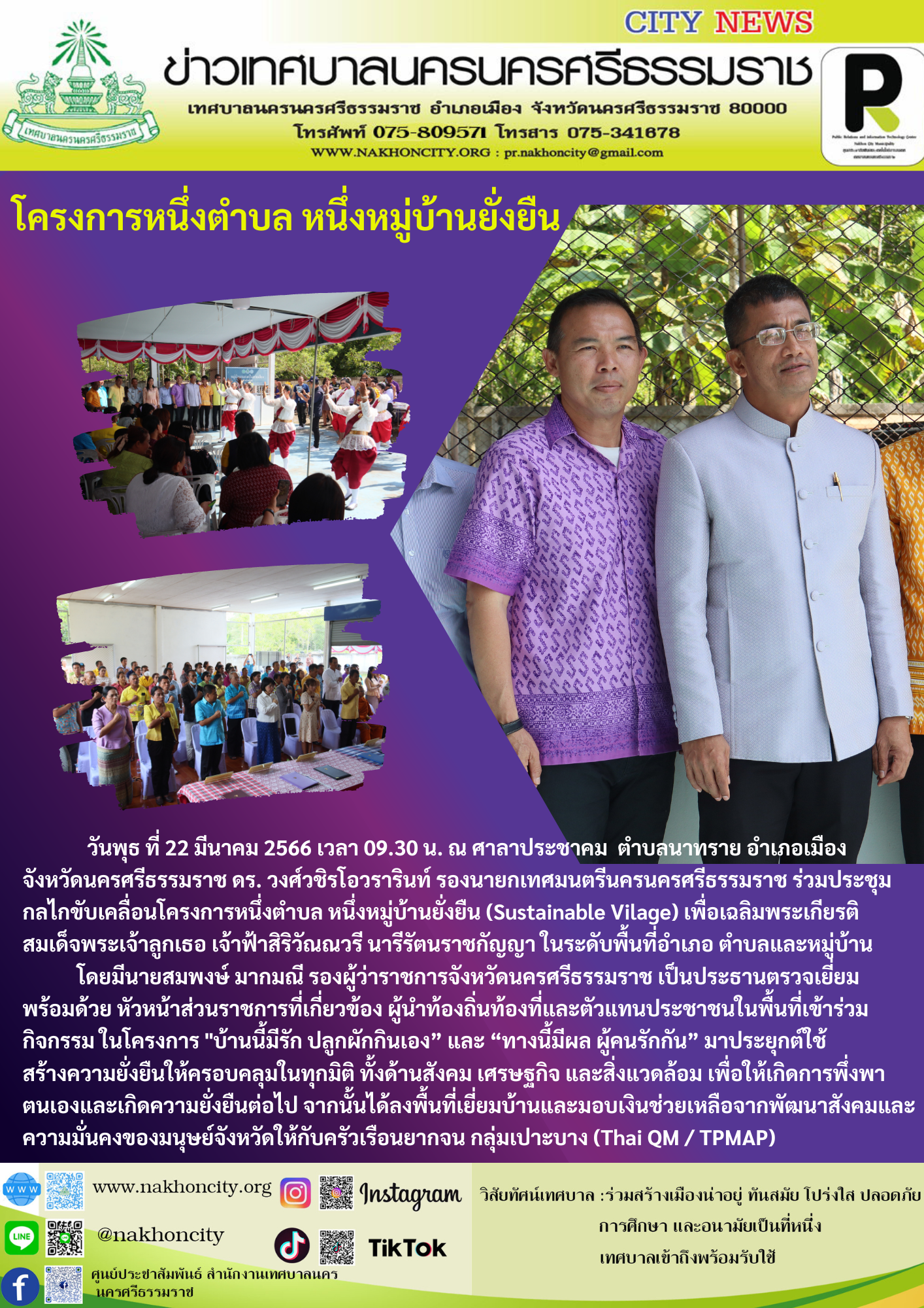 วันพุธ ที่ 22 มีนาคม 2566 เวลา 09.30 น. ณ ศาลาประชาคม หมู่ที่ 4 ตำบลนาทราย อำเภอเมืองนครศรีธรรมราช จังหวัดนครศรีธรรมราช ดร. วงศ์วชิร โอวรารินท์ รองนายกเทศมนตรีนครนครศรีธรรมราช ร่วม ประชุมกลไกขับเคลื่อนโครงการหนึ่งตำบล หนึ่งหมู่บ้านยั่งยืน (Sustainable Vilage) เพื่อเฉลิมพระเกียรติสมเด็จพระเจ้าลูกเธอ เจ้าฟ้าสิริวัณณวรี นารีรัตนราชกัญญา ในระดับพื้นที่อำเภอ ตำบลและหมู่บ้าน โดยมีนายสมพงษ์ มากมณี รองผู้ว่าราชการจังหวัดนครศรีธรรมราช เป็นประธานตรวจเยี่ยม พร้อมด้วย หัวหน้าส่วนราชการที่เกี่ยวข้อง ผู้นำท้องถิ่นท้องที่และตัวแทนประชาชนในพื้นที่เข้าร่วมกิจกรรม ในโครงการ "บ้านนี้มีรัก ปลูกผักกินเอง” และ “ทางนี้มีผล ผู้คนรักกัน” มาประยุกต์ใช้ สร้างความยั่งยืนให้ครอบคลุมในทุกมิติ ทั้งด้านสังคม เศรษฐกิจ และสิ่งแวดล้อม เพื่อให้เกิดการพึ่งพาตนเองและเกิดความยั่งยืนต่อไป จากนั้นได้ลงพื้นที่เยี่ยมบ้านและมอบเงินช่วยเหลือจากพัฒนาสังคมและความมั่นคงของมนุษย์จังหวัดให้กับครัวเรือนยากจน กลุ่มเปาะบาง (Thai QM / TPMAP) |