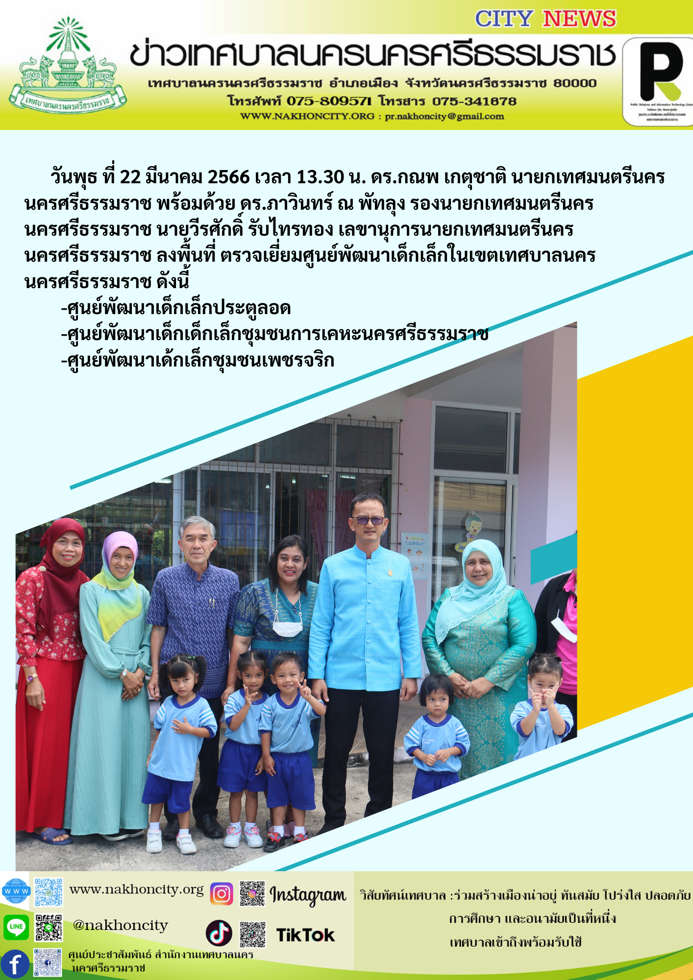 วันพุธ ที่ 22 มีนาคม 2566 เวลา 13.30 น. ดร.กณพ เกตุชาติ นายกเทศมนตรีนครนครศรีธรรมราช พร้อมด้วย ดร.ภาวินทร์ ณ พัทลุง รองนายกเทศมนตรีนครนครศรีธรรมราช นายวีรศักดิ์ รับไทรทอง เลขานุการนายกเทศมนตรีนครนครศรีธรรมราช ลงพื้นที่ ตรวจเยี่ยมศูนย์พัฒนาเด็กเล็กในเขตเทศบาลนครนครศรีธรรมราช ดังนี้